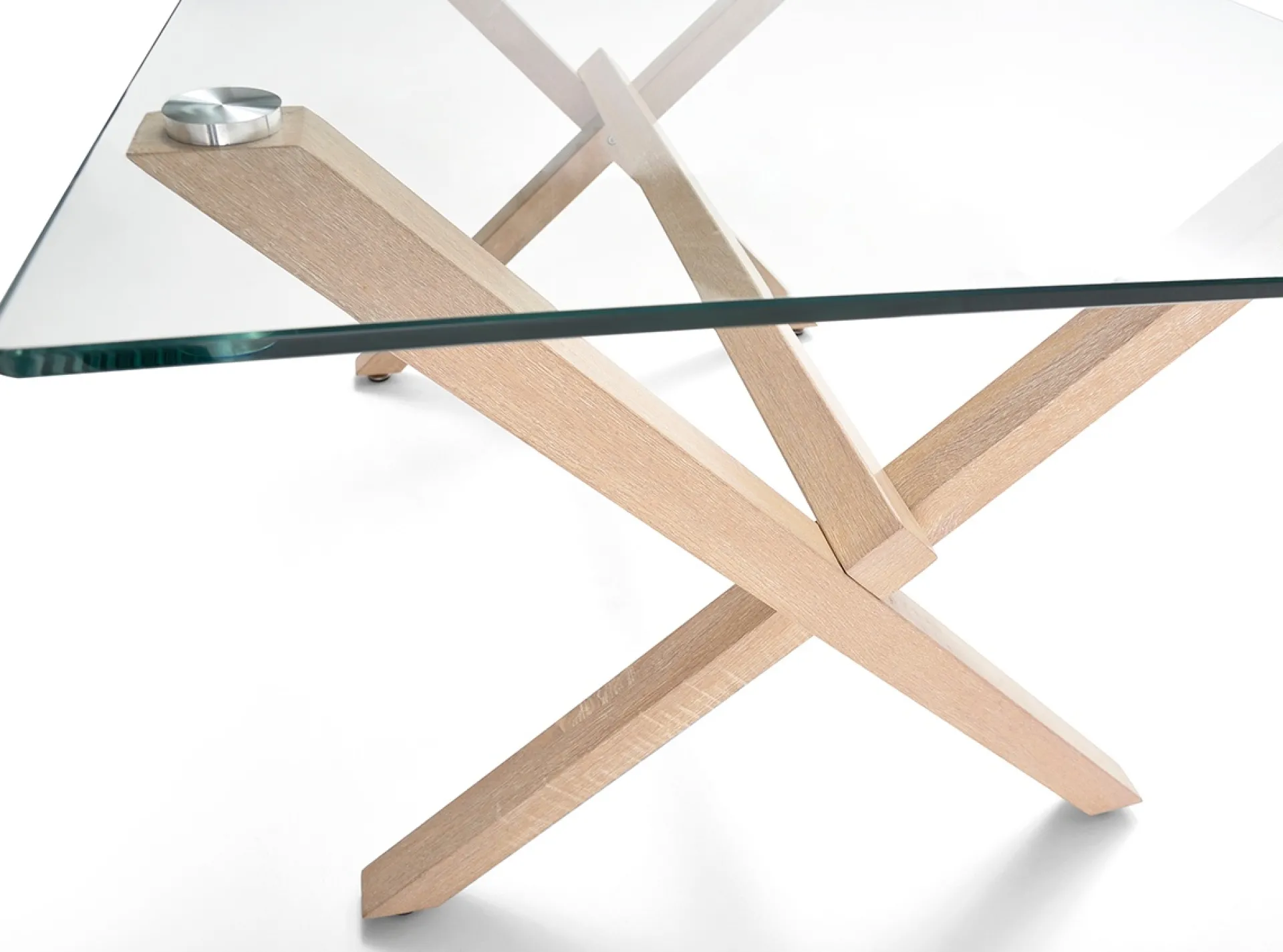 La característica forma de la estructura de esta mesa con sobre decristal y el acabadoimitación madera le aportan personalidad propia y calidez visual. Es un modelo que puede encajar en cualquier espacio, ya sea como mesa de salón/comedor o como escritorio.