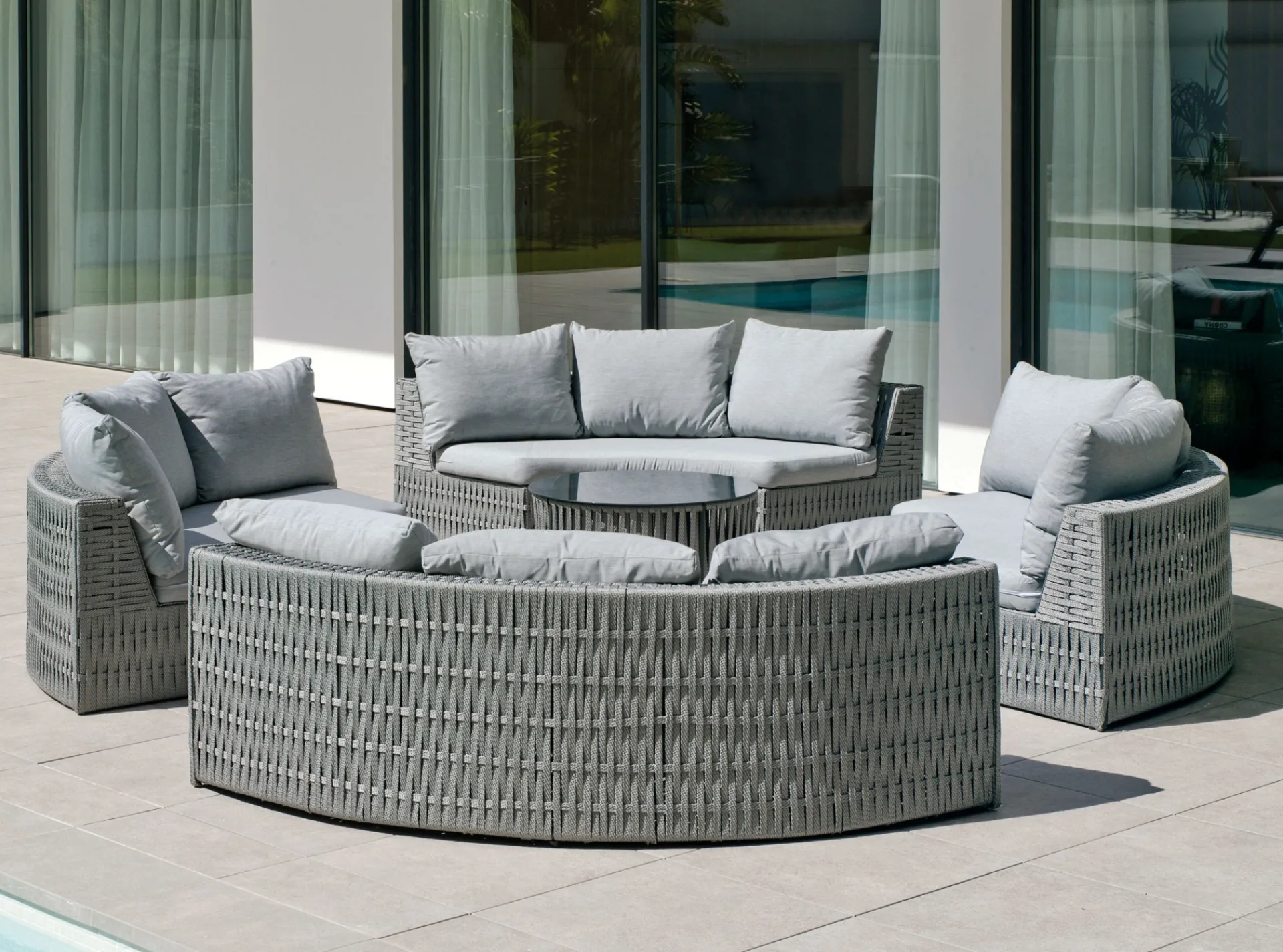 Tela de fibra sintética acrílica 100% teñida y ecológica con protección teflón resistente a la luz solar, agua marina, manchas, hongos y lavados.