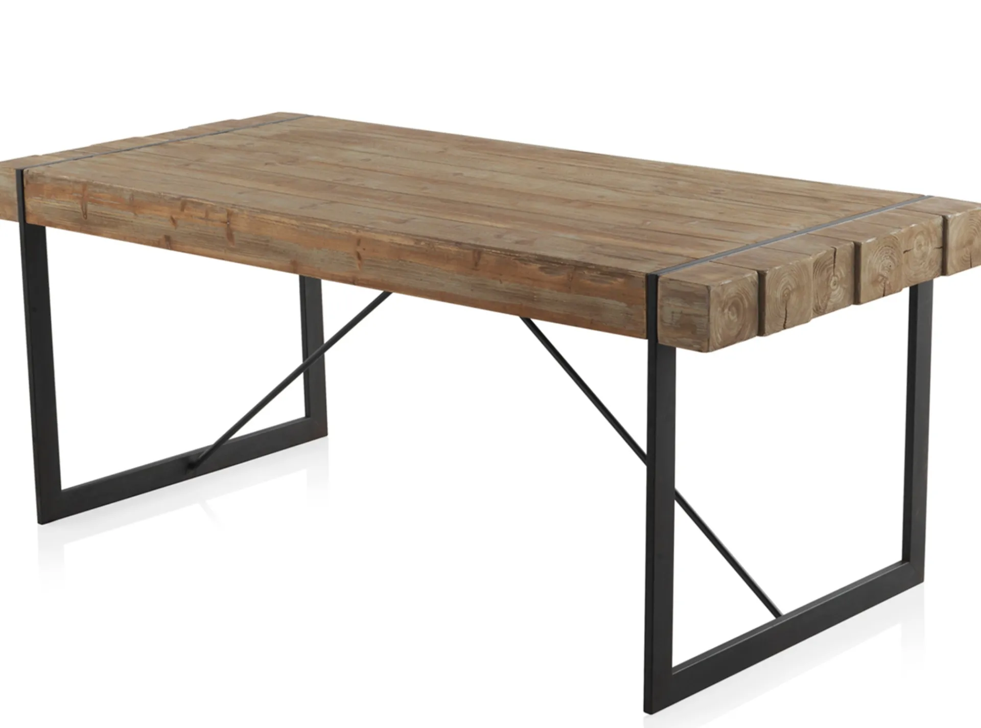 Mesa ligeramente rugosa de chapa natural de madera de abeto y patas de metal indicada para 6-8 comensales.
