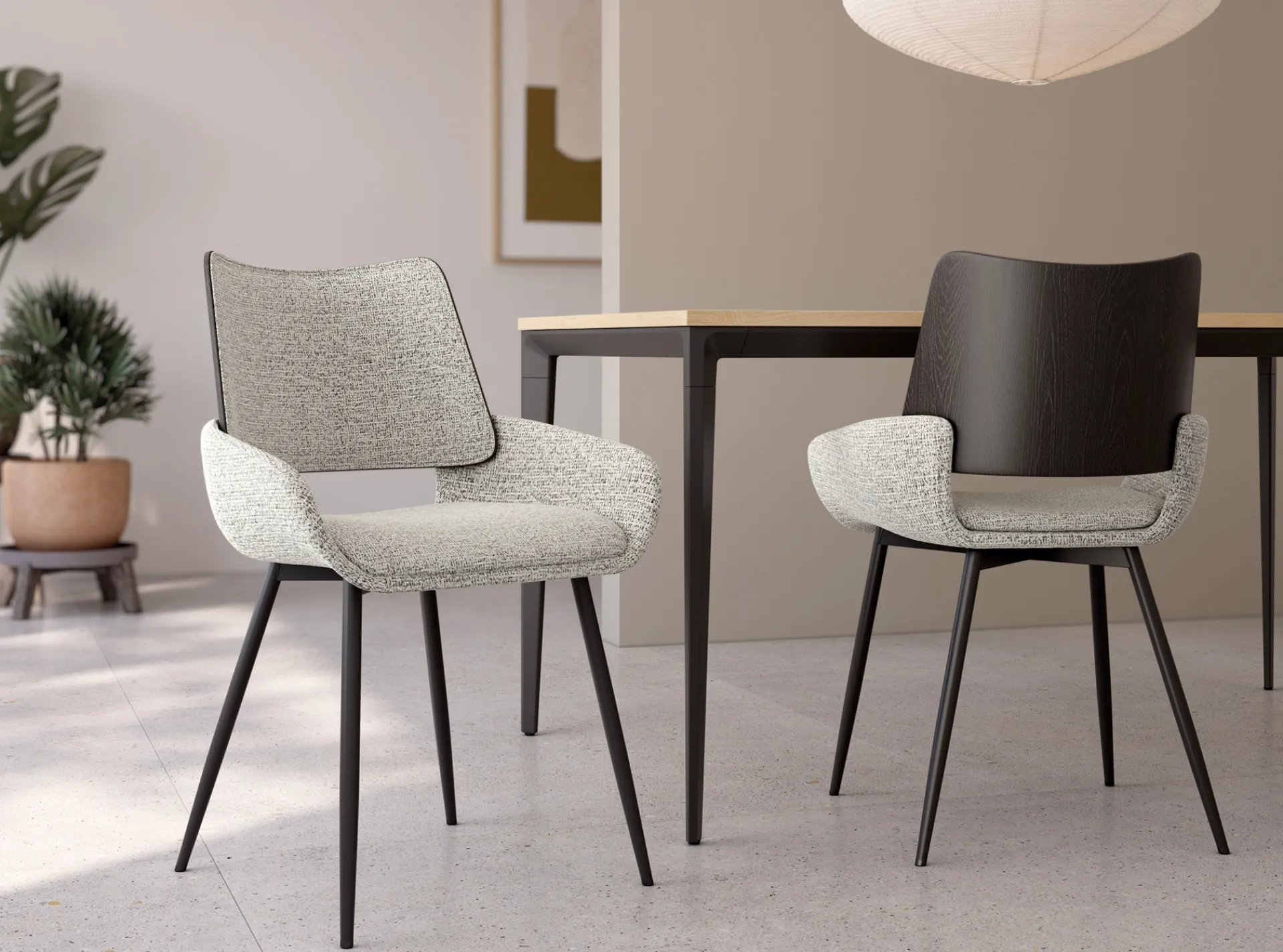 Elegantes silla tapizada en suave tela con respaldo en chapa natural de roble. El tapizado le aporta comodidad y un aspecto sofisticado. Las patas son de metal negro y resistente.