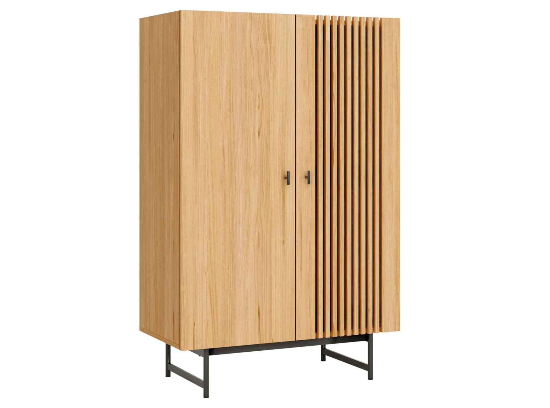 Aparador alto con estructura realizada en chapa natural de roble y patas de metal. Por sus dimensiones, resulta ideal como mueble auxiliar de almacenaje del salón.