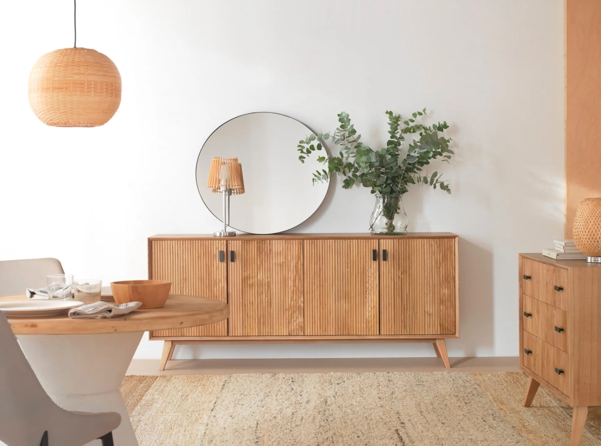 Aparador de cuatro puertas alistonadas con dos huecos con estante a media altura ideales para almacenar todo tipo de objetos.