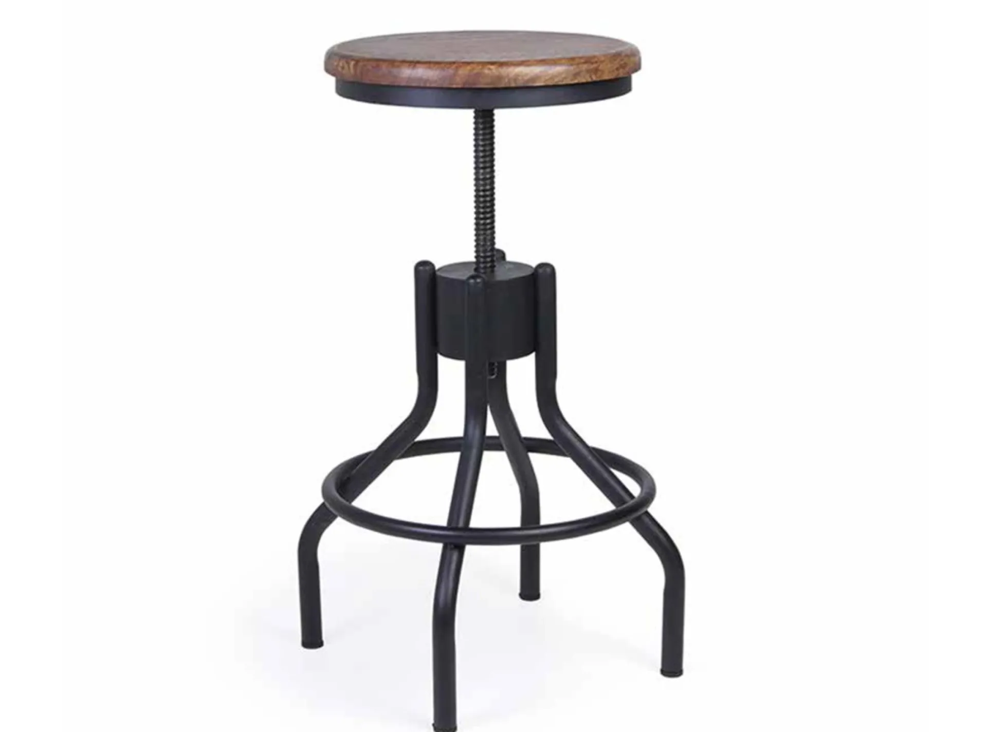Taburete estilo industrial de altura regulable en con asiento de madera maciza de mango y estructura dehierro.