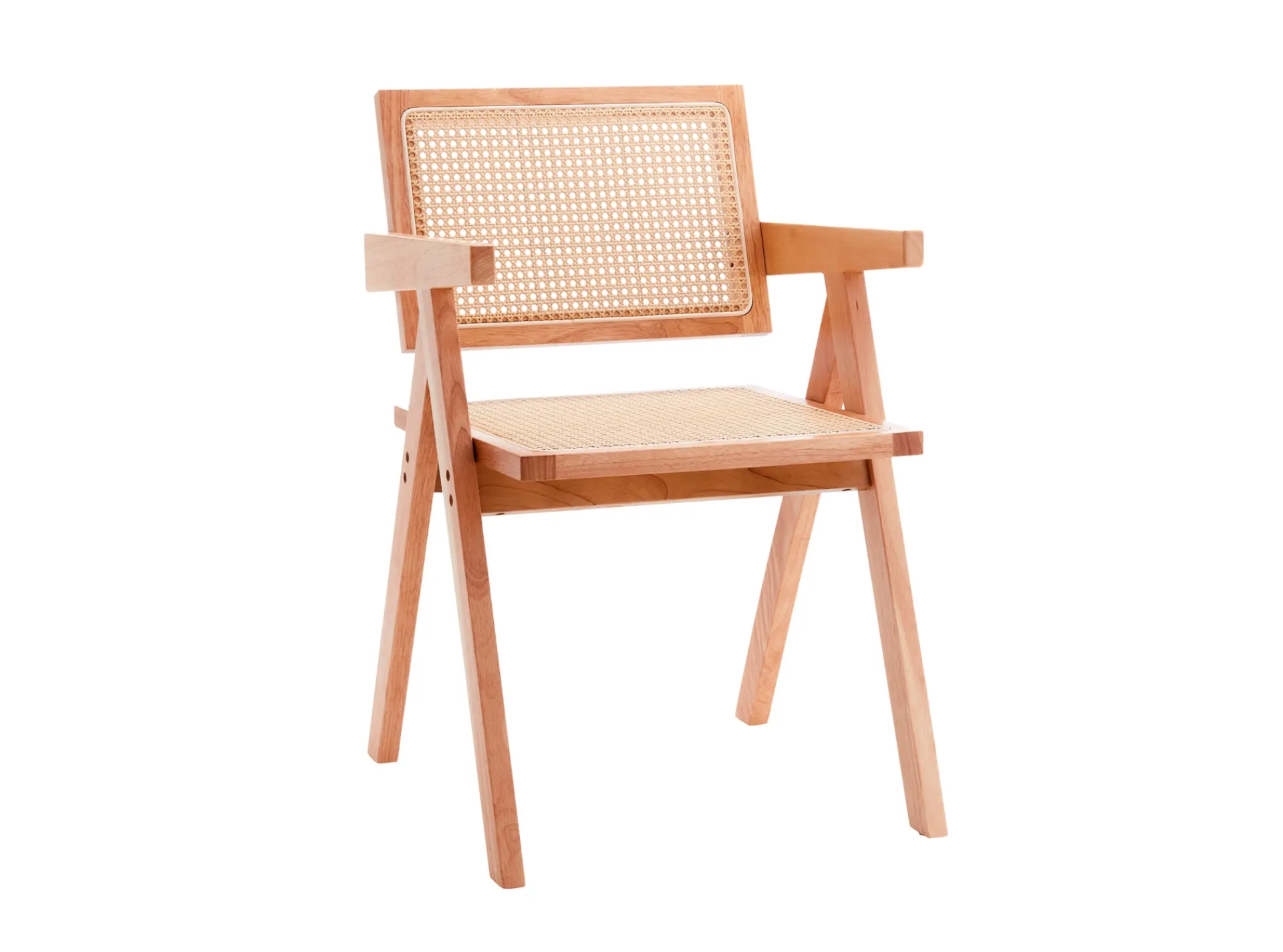 Elegante y atemporal, esta silla con brazos combina la solidez de la madera maciza con la ligereza y calidez natural del ratán tejido, logrando una pieza que equilibra forma y funcionalidad con un estilo auténticamente artesanal. Es perfecta para cualquier estancia.