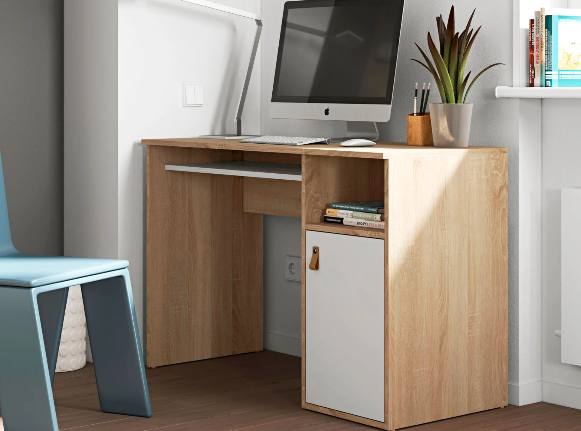 El moderno escritorio PULSO combina la calidez de un acabado en color madera con blanco o negro, según elección. Ofrece una superficie de trabajo funcional y organizada. Su diseño integra un espacio de almacenamiento lateral con puerta batiente, una bandeja y un hueco ideal para mantener el espacio ordenado.