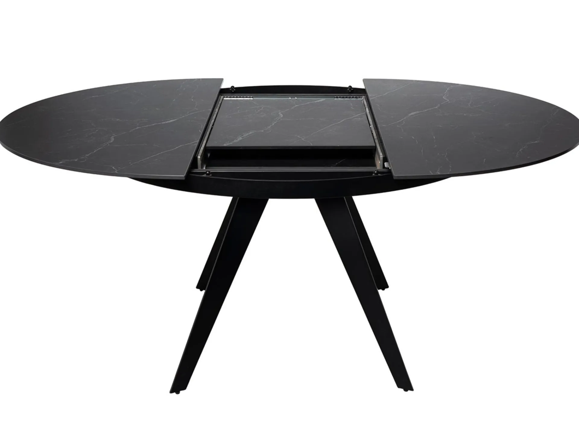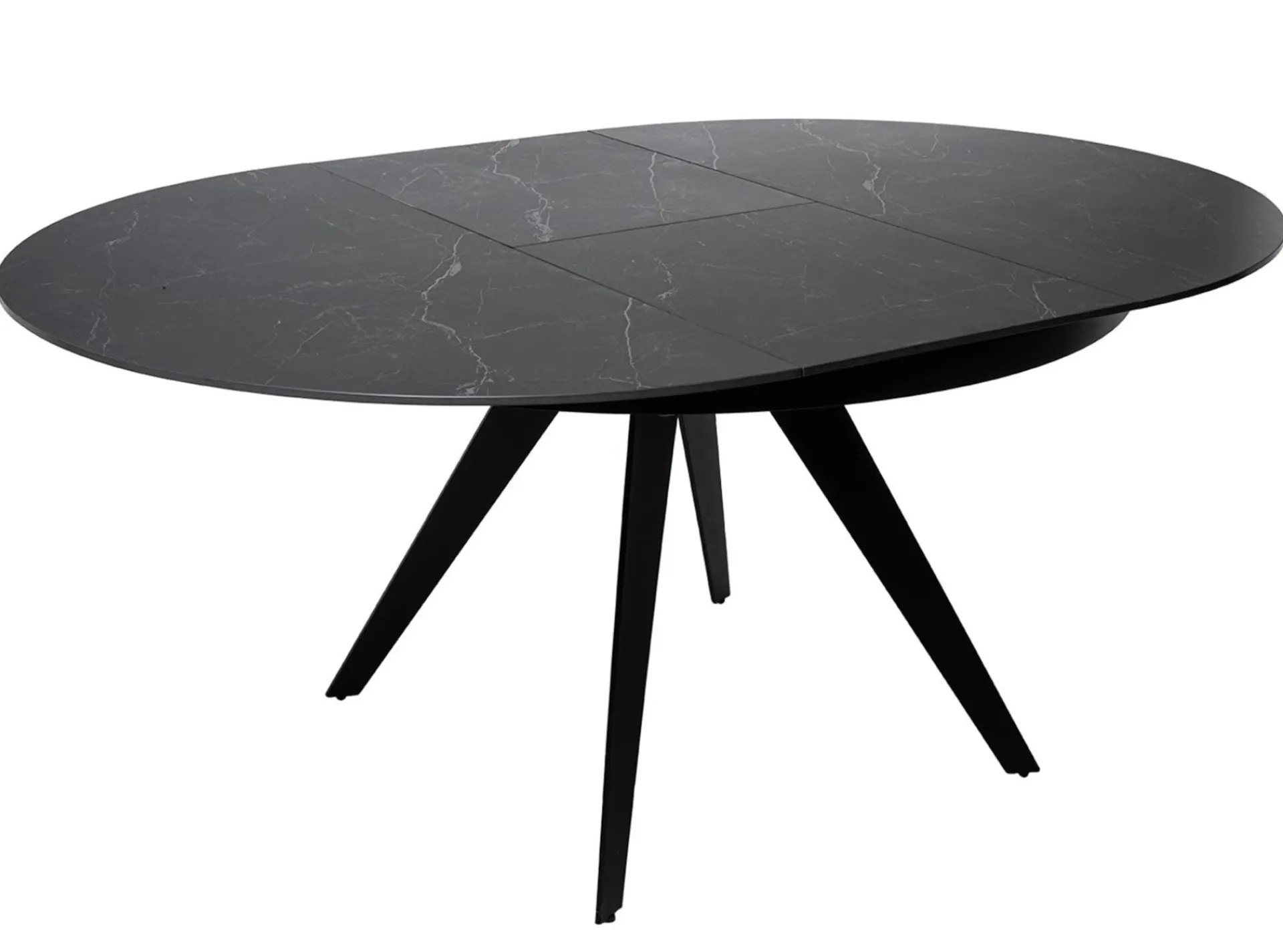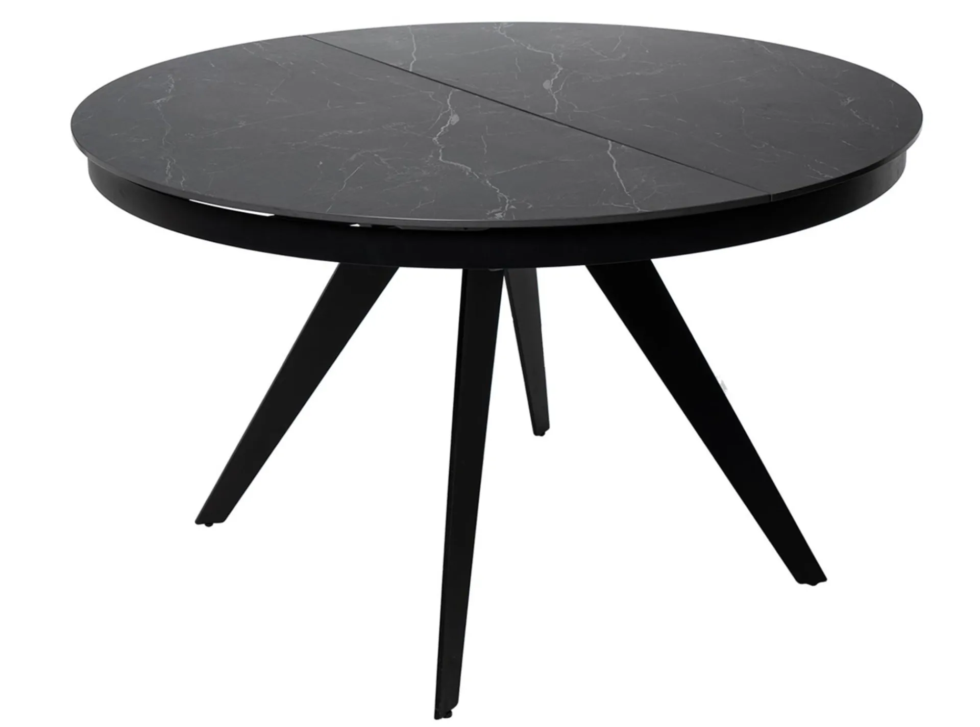 Una mesa con sobre extensible porcelánico, el cual le brinda un aspecto moderno y sofisticado, además de ser resistente y fácil de limpiar. Las patas metálicas lacadas en negro complementan el diseño, aportando un toque de elegancia y robustez.