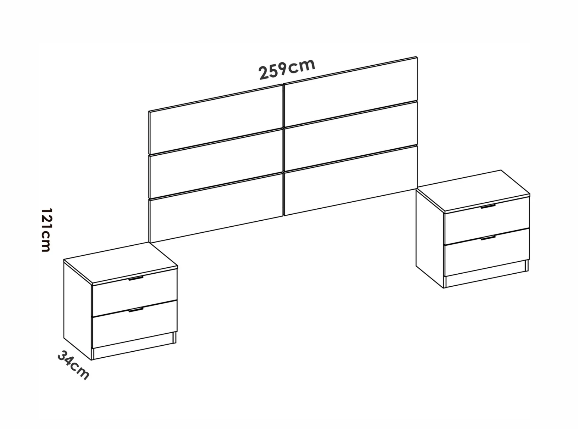 259 cm de ancho x 121 cm de alto x 34,5 cm de fondo.