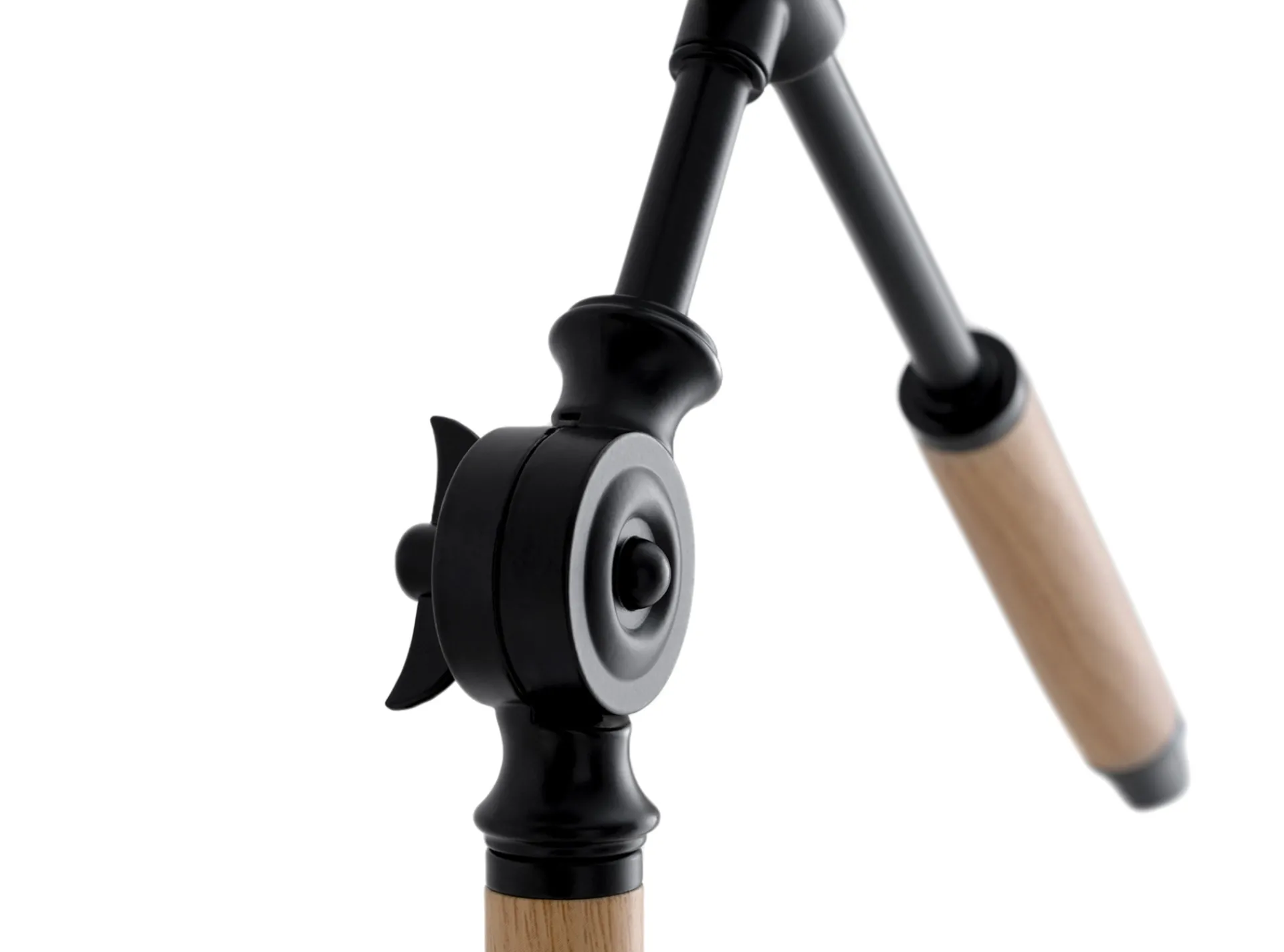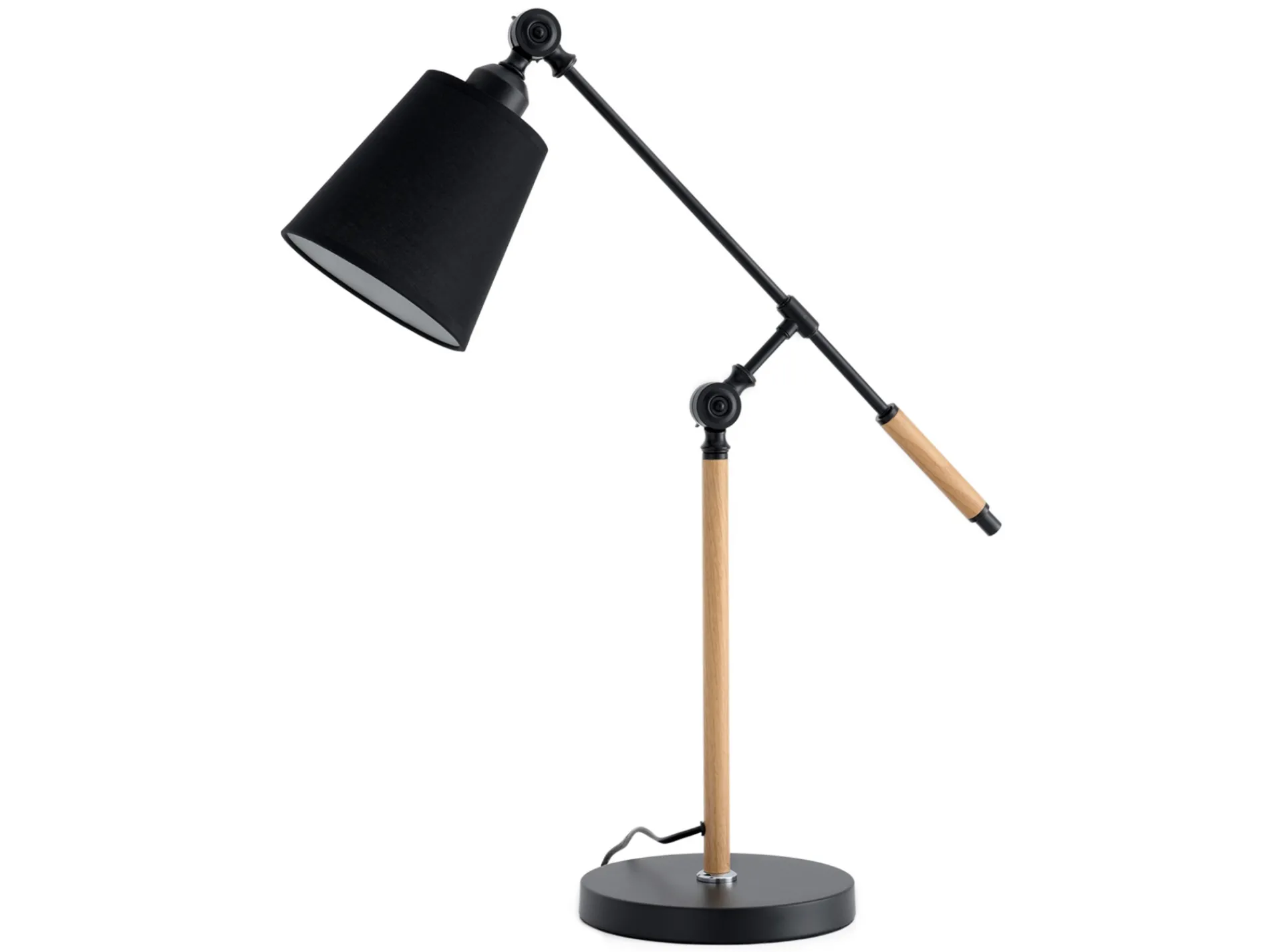 Lámpara de sobremesa de líneas rectas realizada en metal y madera con pantalla de tela. El punto de luz ideal para tu despacho u oficina de trabajo.