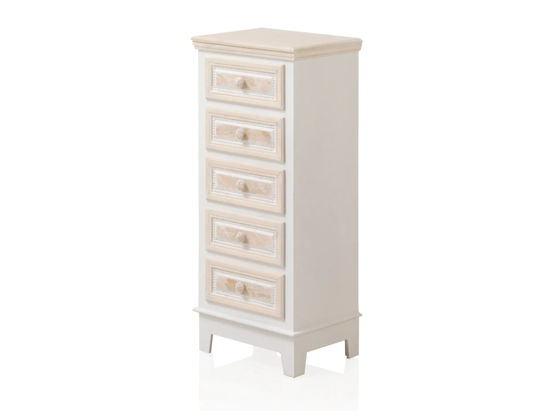 Este versátil sinfonier de chapa natural de abeto con cajones de color crema y tiradores de madera aporta un toque de calidez a cualquier habitación. La decoración en los frentes de los cajones le otorga un toque de sofisticación.