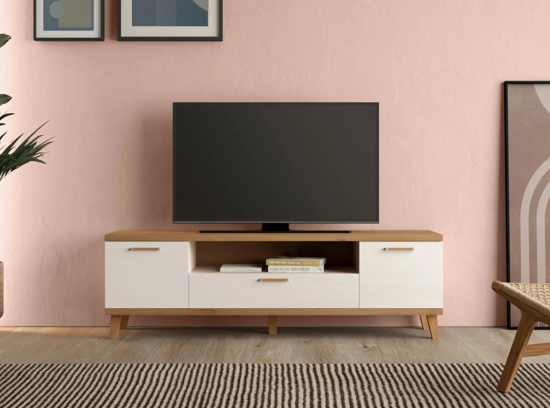 Perfecciona tu sala de estar con este moderno mueble de TV. Dotado de dos puertas batientes, un cajón y un amplio hueco, este mueble proporciona un espacio de almacenamiento ideal para tus dispositivos multimedia y otros objetos esenciales. Con su diseño elegante y funcional, este mueble complementará perfectamente la decoración de tu salón, ofreciendo tanto estilo como practicidad.