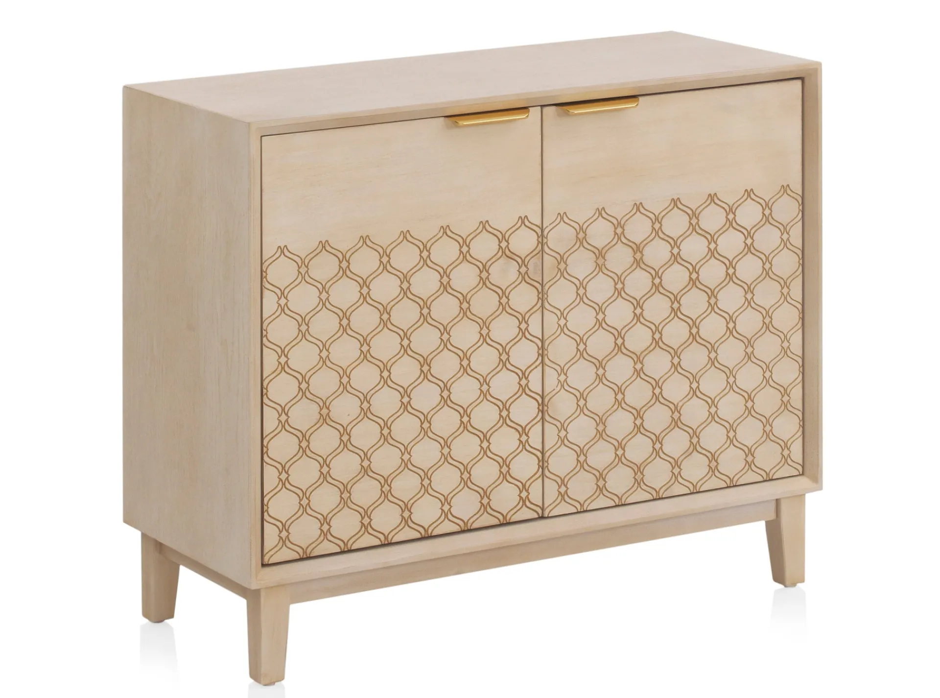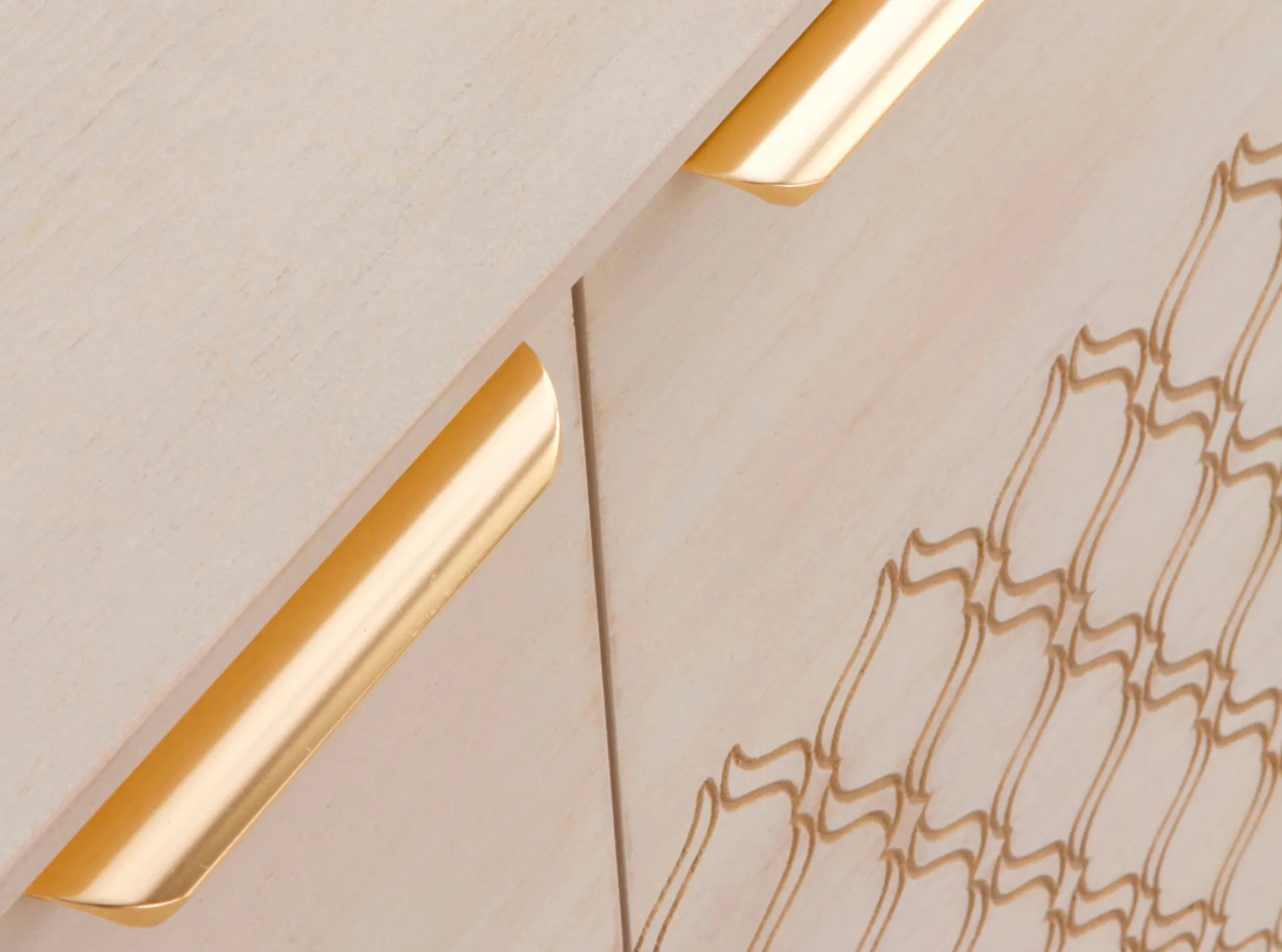 Frente labrado con dibujo geométrico y pintado en color oro viejo.