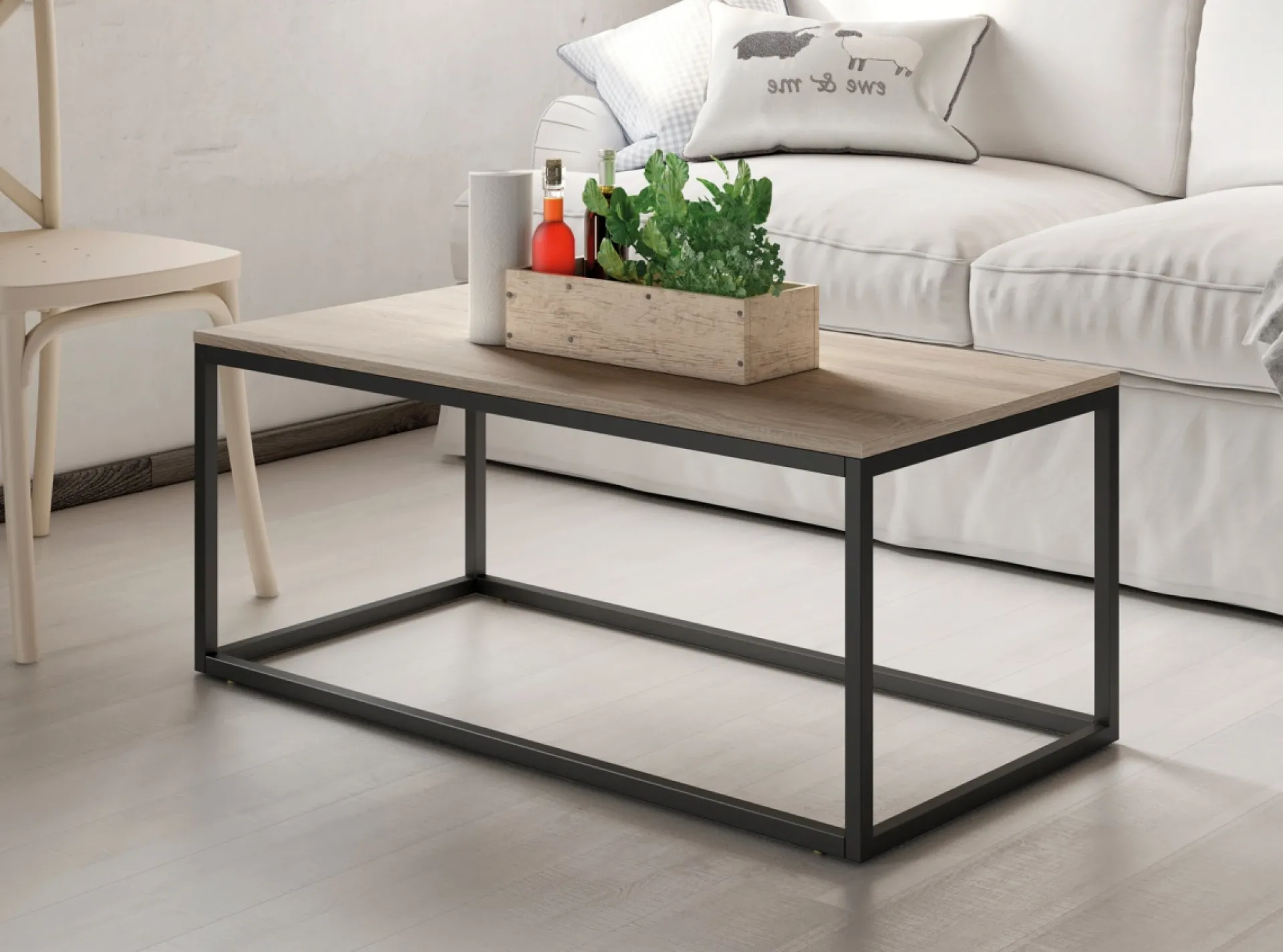 Complementa tu estancia con esta mesa de centro rectangular con patas metálicas negras.