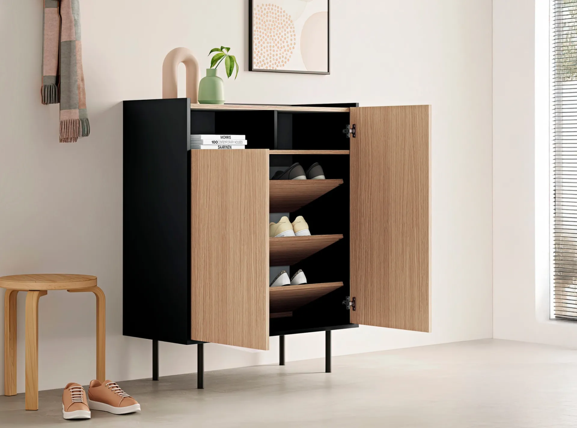 El zapatero BOSCO de diseño compacto combina la sobriedad de su estructura en tono oscuro con la calidez de un frontal en color madera. Incorpora un práctico espacio abierto en la parte superior, ideal para exhibir objetos decorativos o para un acceso rápido, junto a dos puertas batientes que ocultan estantes para zapatos que pueden montarse inclinados o rectos según tu estilo.