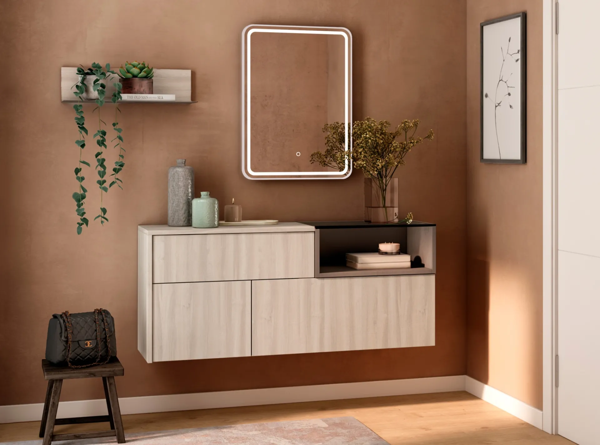 Transforma tu recibidor con esta versátil composición modular. Olvídate de paredes vacías y elige la funcionalidad y el estilo. Compuesto en la parte izquierda por un cajón y una puerta batiente y en la parte derecha por un espacio hueco con sobre de bonito cristal. En la parte inferior un espacio con puerta batiente de abertura de de arriba a abajo.