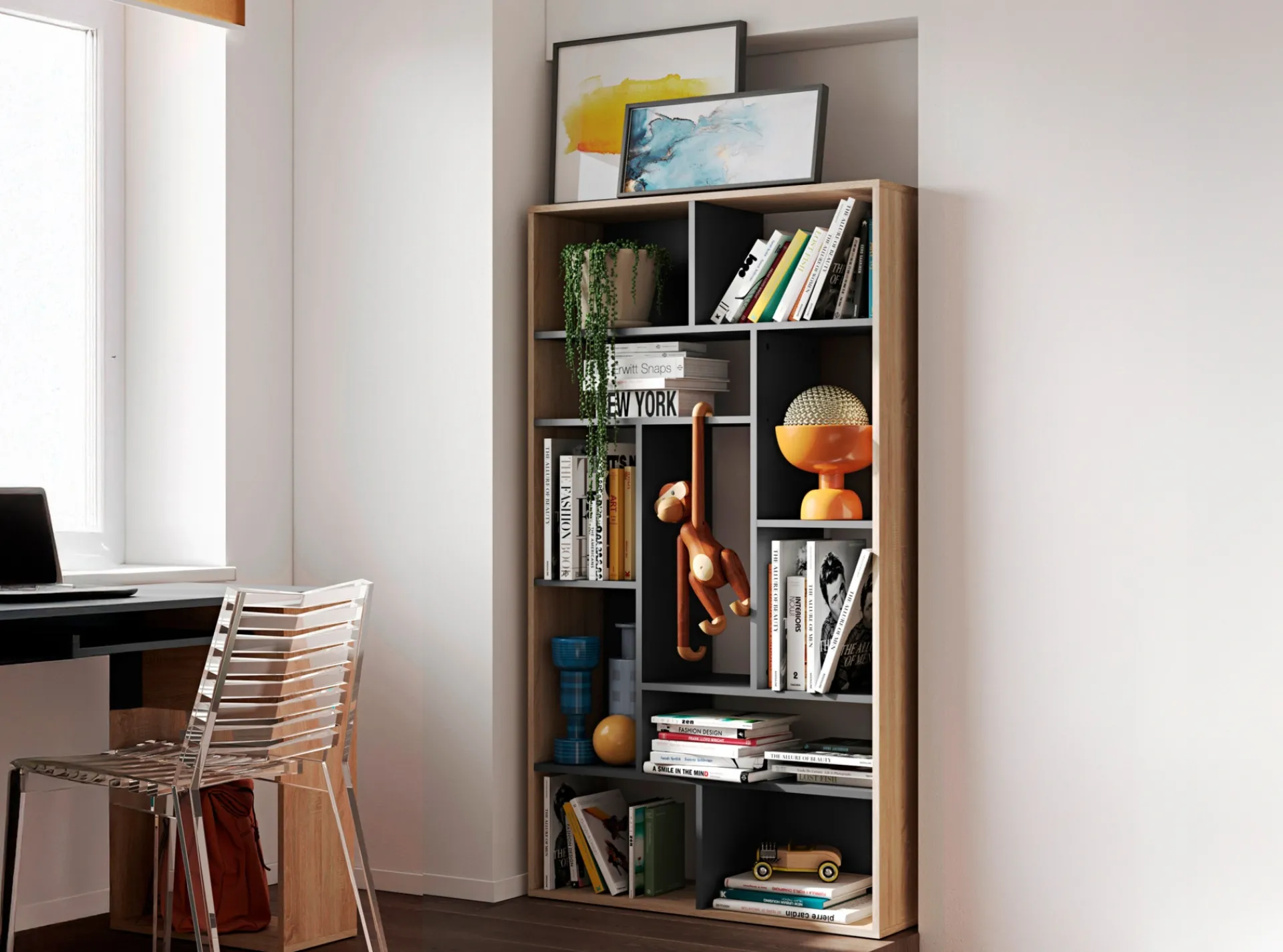La estantería modular ZENIT presenta un diseño contemporáneo, que combina el marco exterior en color roble con estantes internos blancos o negros. Su configuración asimétrica ofrece una variedad de compartimentos de diferentes tamaños, ideales para organizar libros, objetos decorativos o colecciones.