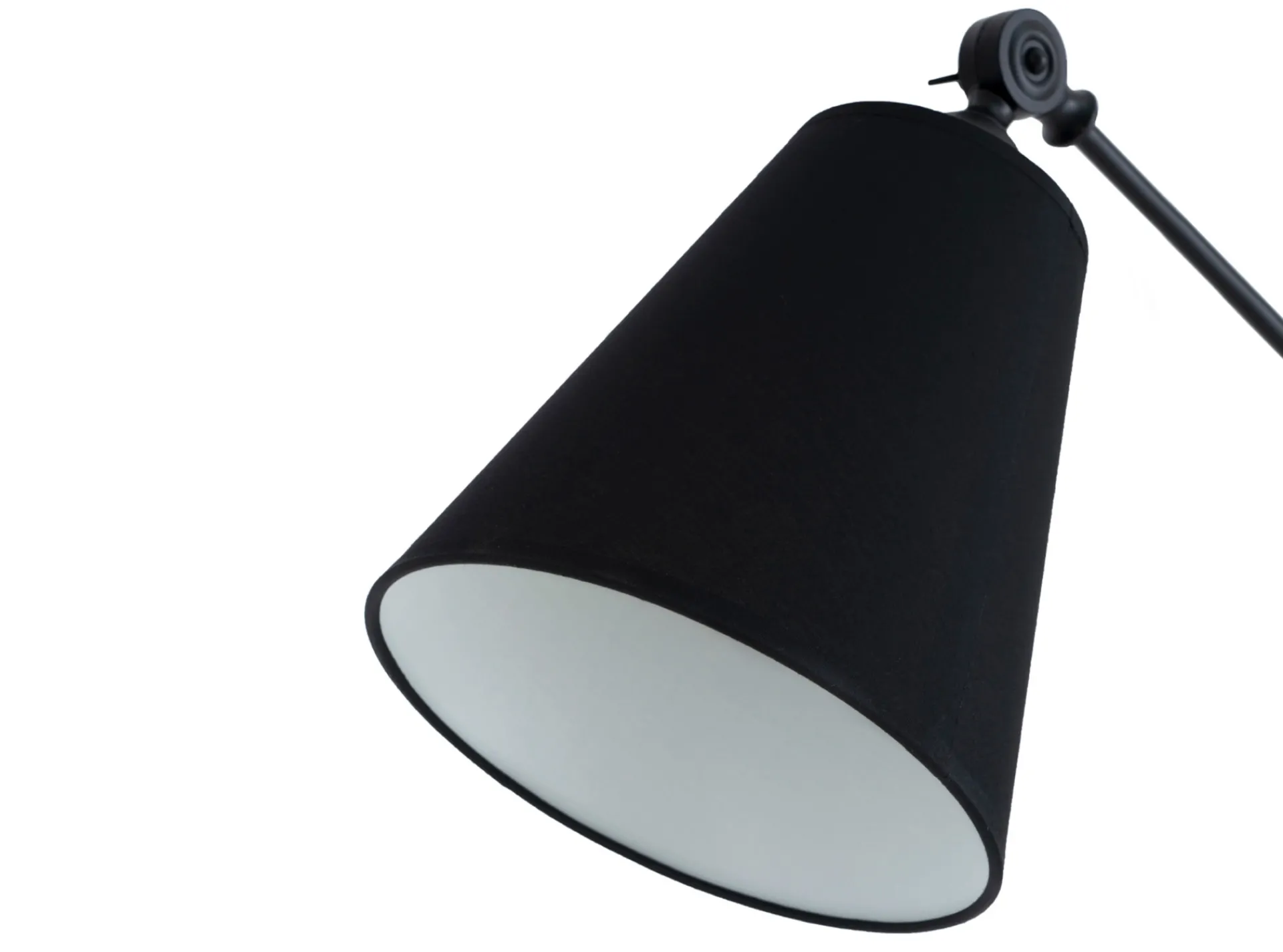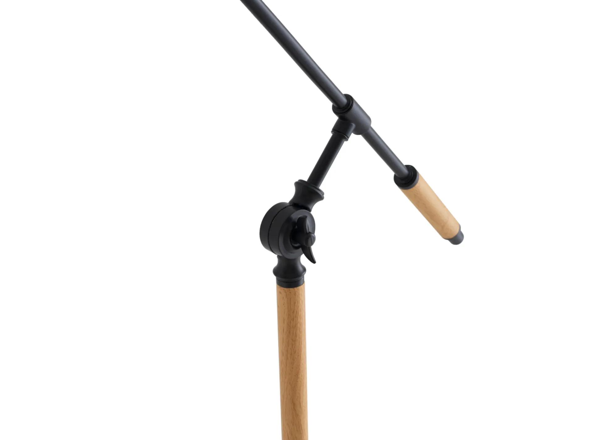 Lámpara de pie de líneas sencillas y rectas fabricada en una combinación de metal y madera. La pantalla tiene forma circular y está realizada en tela.