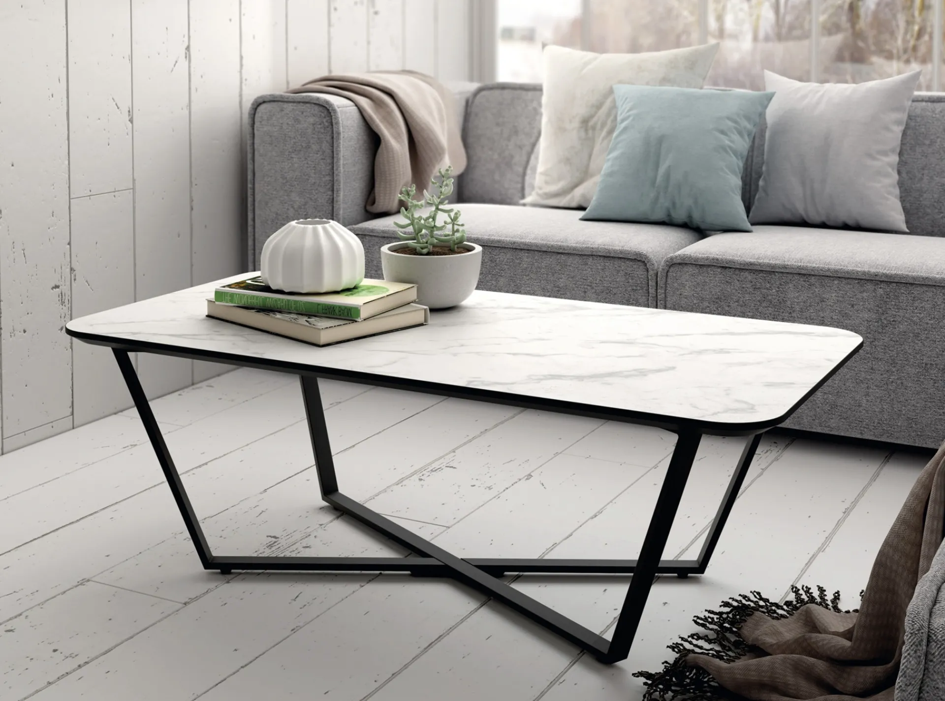 Mesa de centro rectangular con patas metálicas y sobre biselado con diseño piedra perfecta para cualquier ambiente.