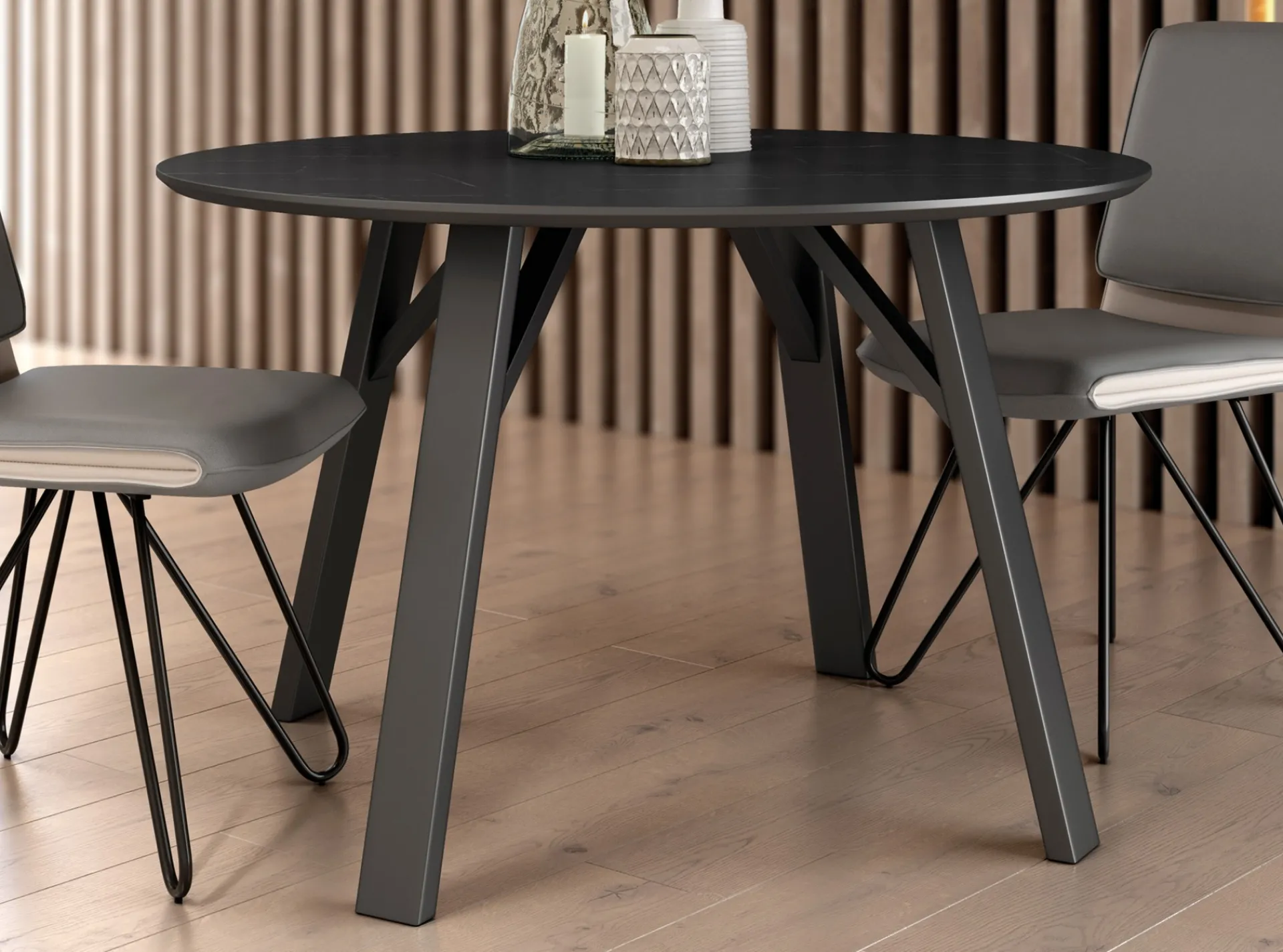 Reúne a tus seres queridos alrededor de esta mesa redonda con patas metálicas y sobre biselado perfecta para combinar con cualquier ambiente.