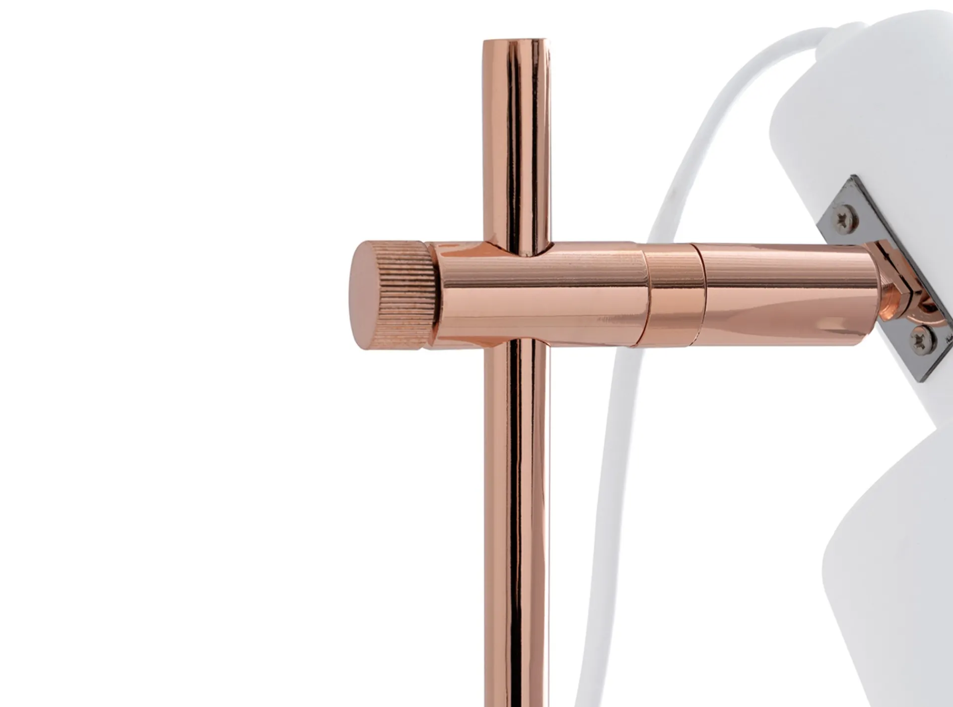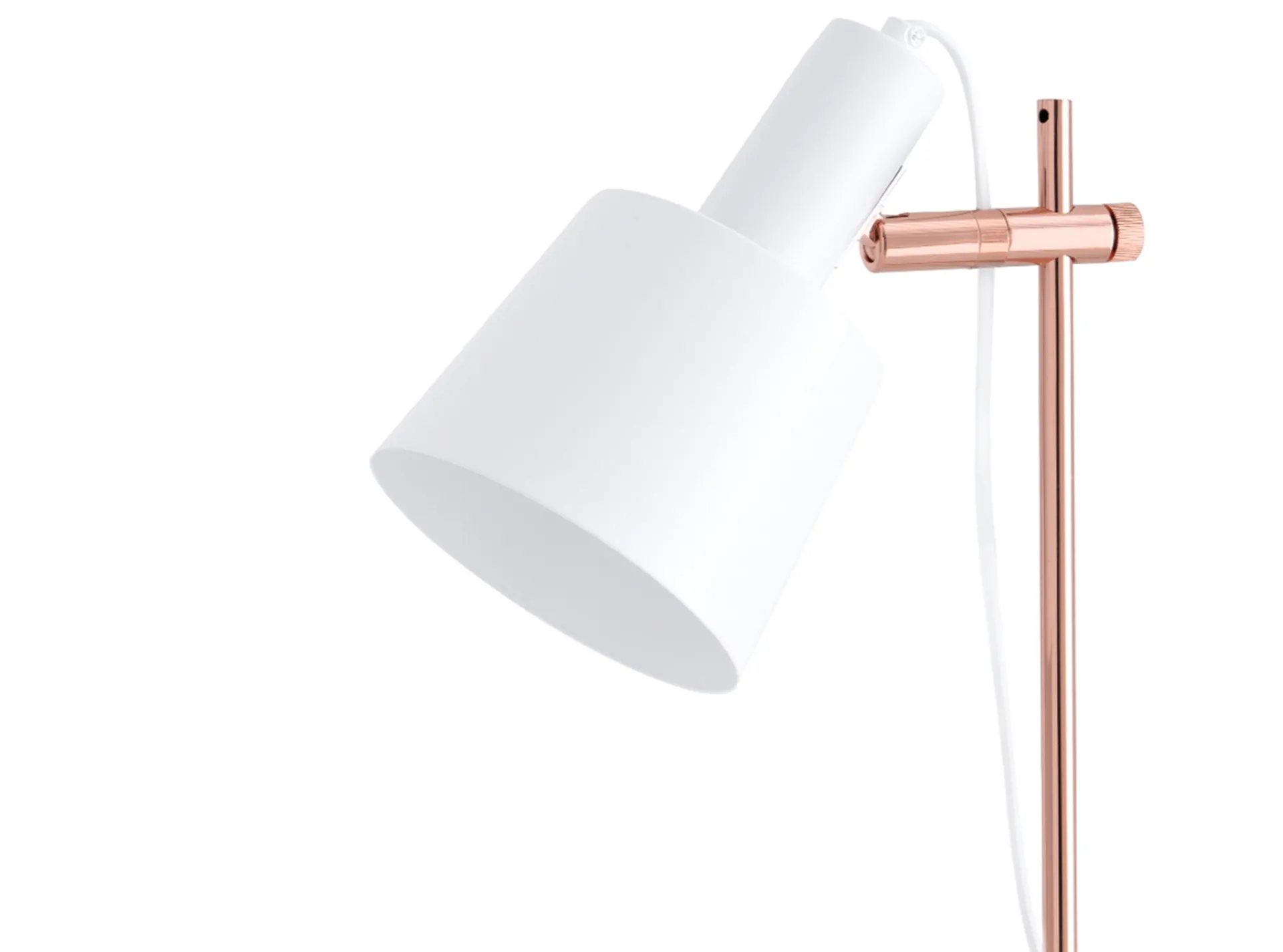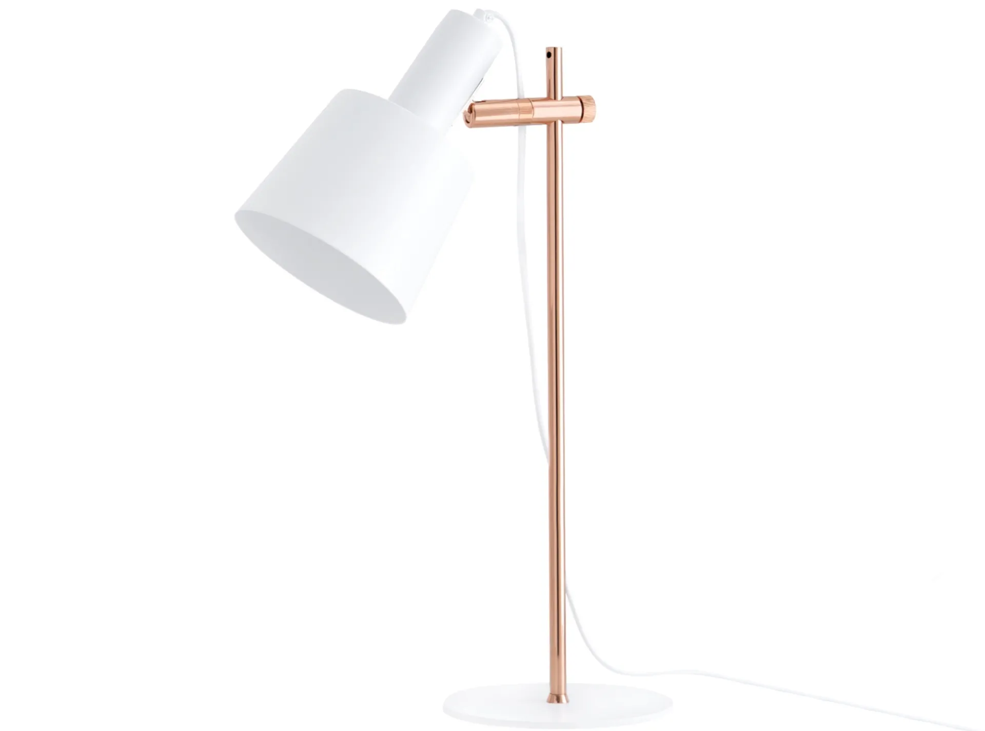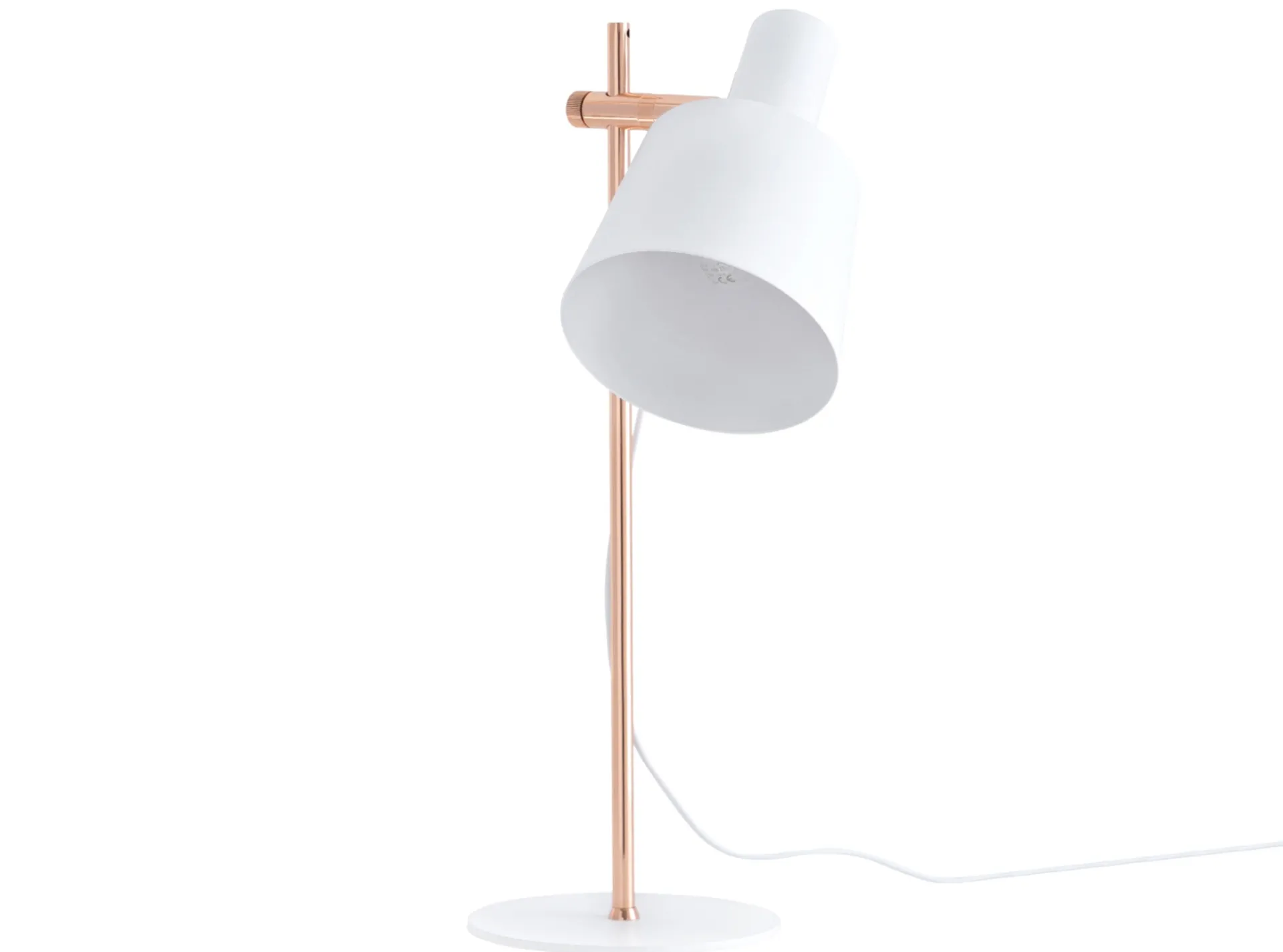 Lámpara de sobremesa realizada en metal con base y pantalla en color blanco y estructura en tono cobrizo.
