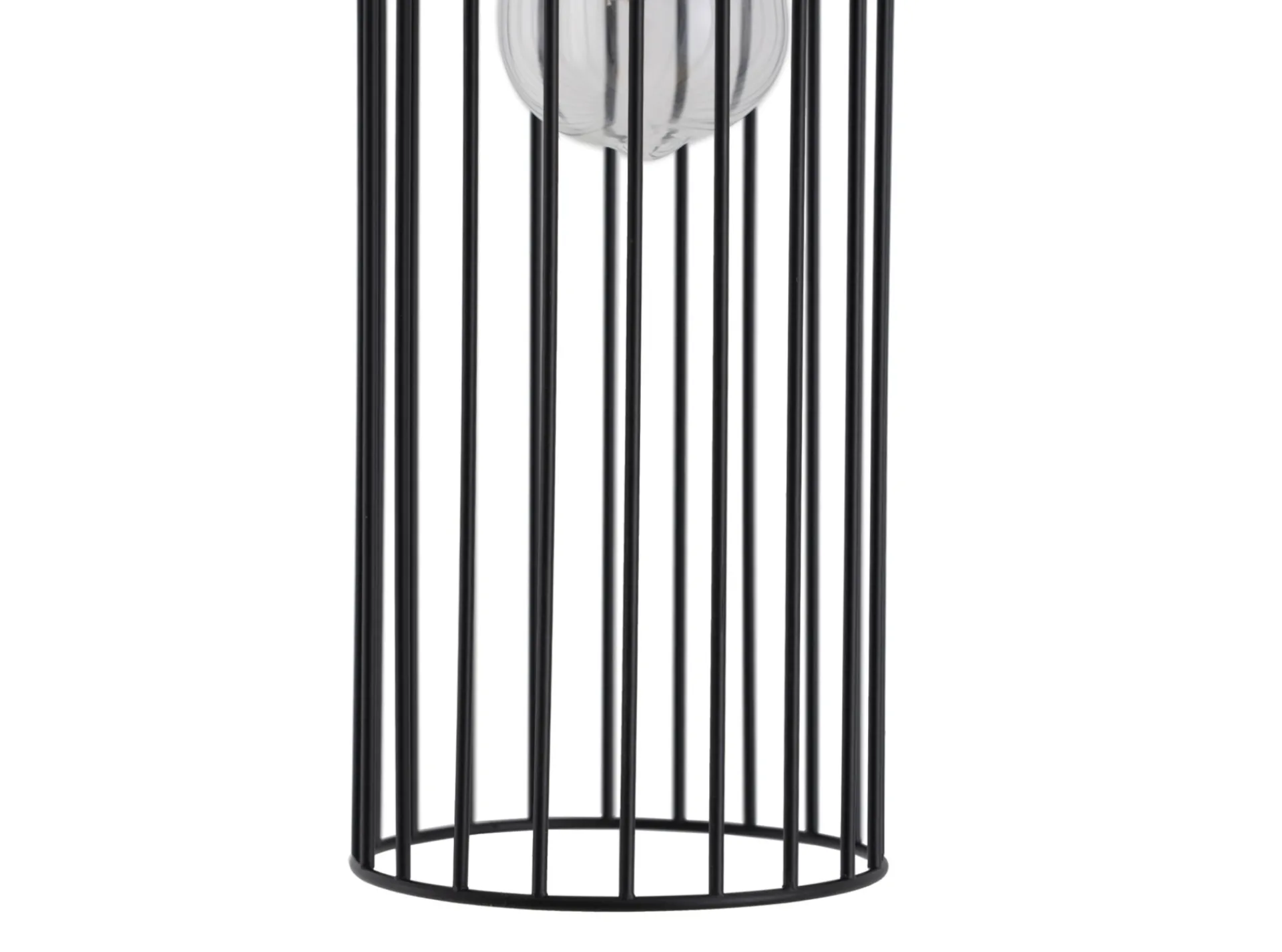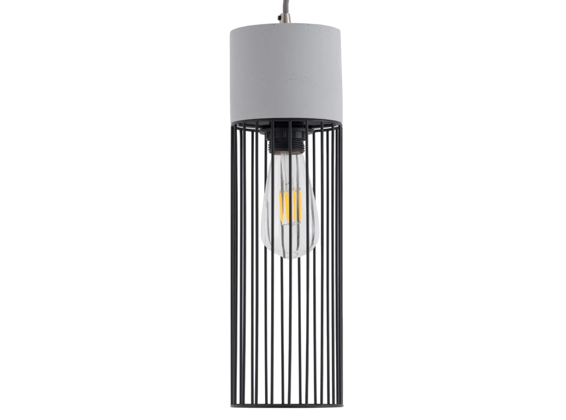 Lámpara de techo cilíndrica con pantalla de varillas metálicas en color negro y embellecedor gris de cemento.