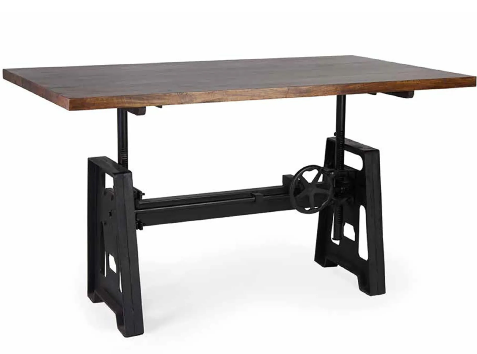 Mesa estilo industrial elevable con sobre demadera maciza de mango y estructura dehierro.