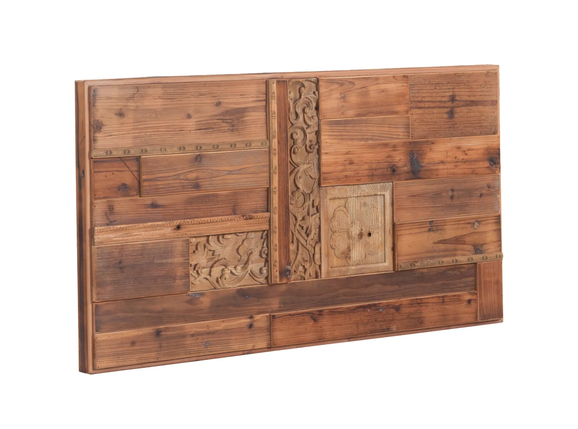 Cabecero de estilo rústico con estructura en chapa natural de abeto y efecto de madera envejecida. La decoración de los frentes está realizada con madera reciclada.