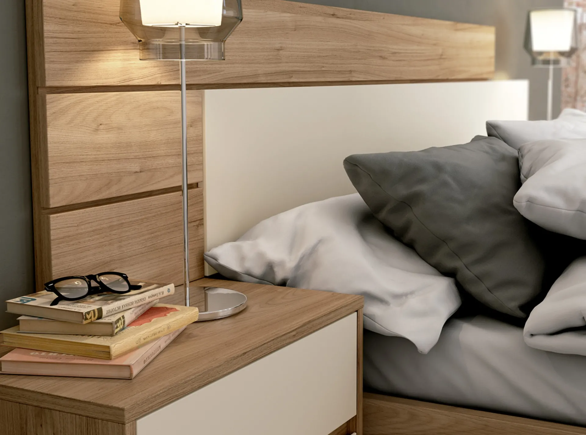 Conjunto de dormitorio de diseño moderno y acogedor, perfecto para crear un ambiente de calma y relax. El aro de cama se complementa con un cabecero asimétrico. Las mesitas de noche a juego, con su diseño limpio y funcionalidad, completan la composición, ofreciendo una solución de almacenamiento práctica y con estilo.