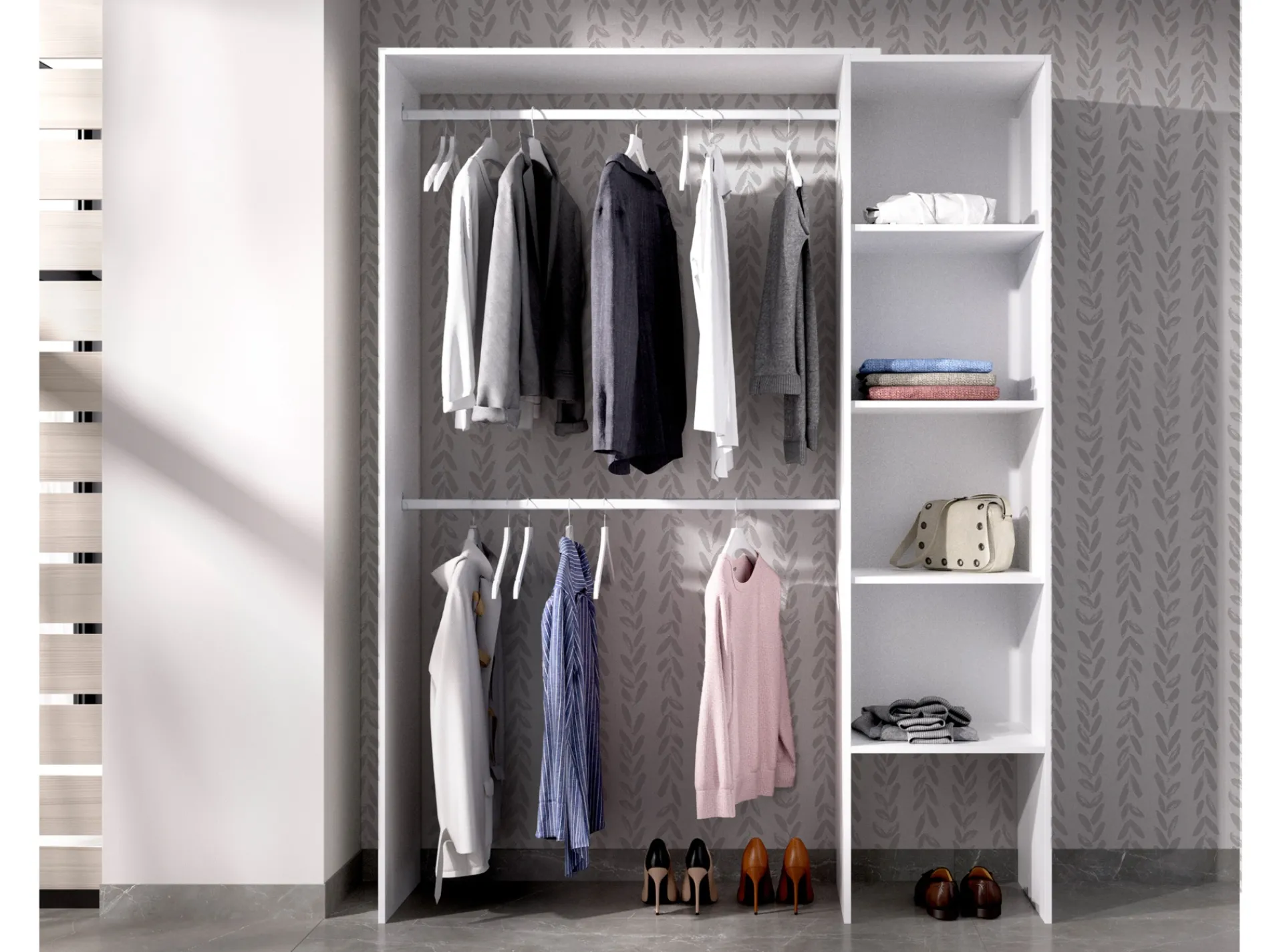 Este módulo está compuesto por una columna con cuatro estantes y dos barras para colgar todo lo que necesites.