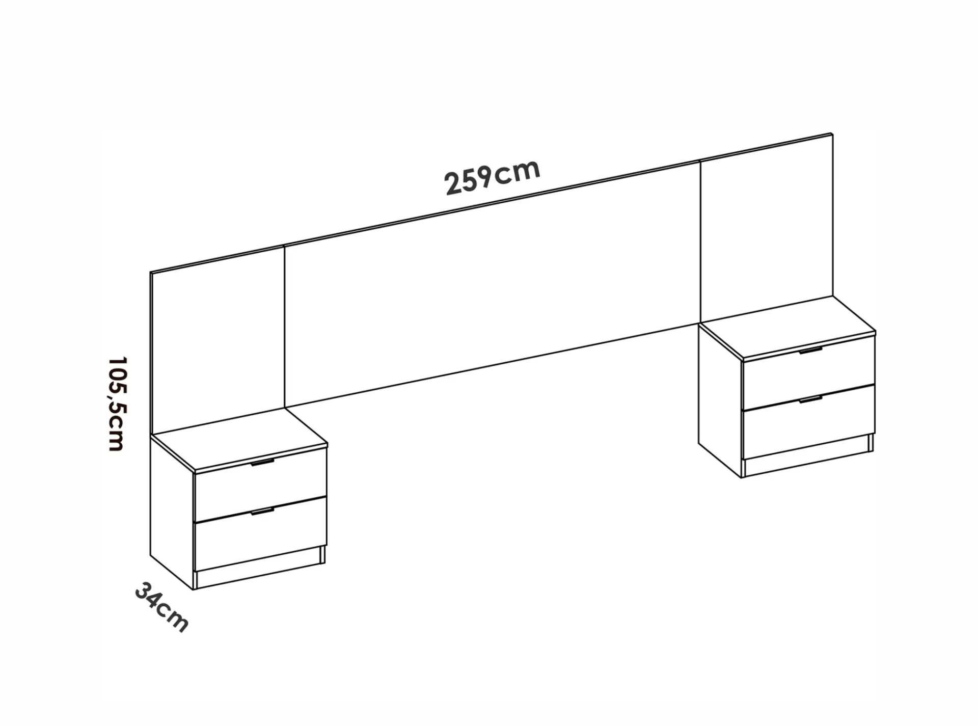 259 cm de ancho x 96/105,5 cm de alto x 34 cm de fondo.