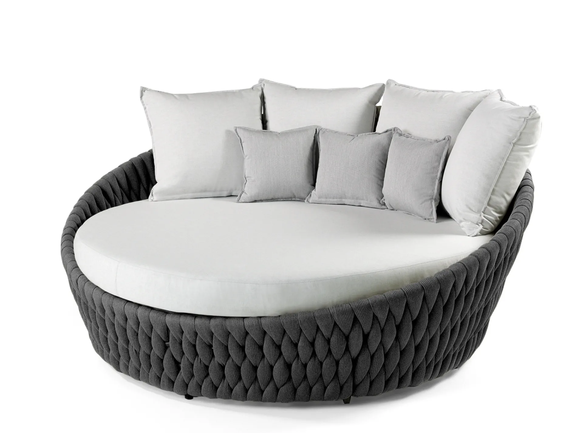 Aluminio lacado en color antracita con un entramado de cuerda textil gruesa en el mismo color.