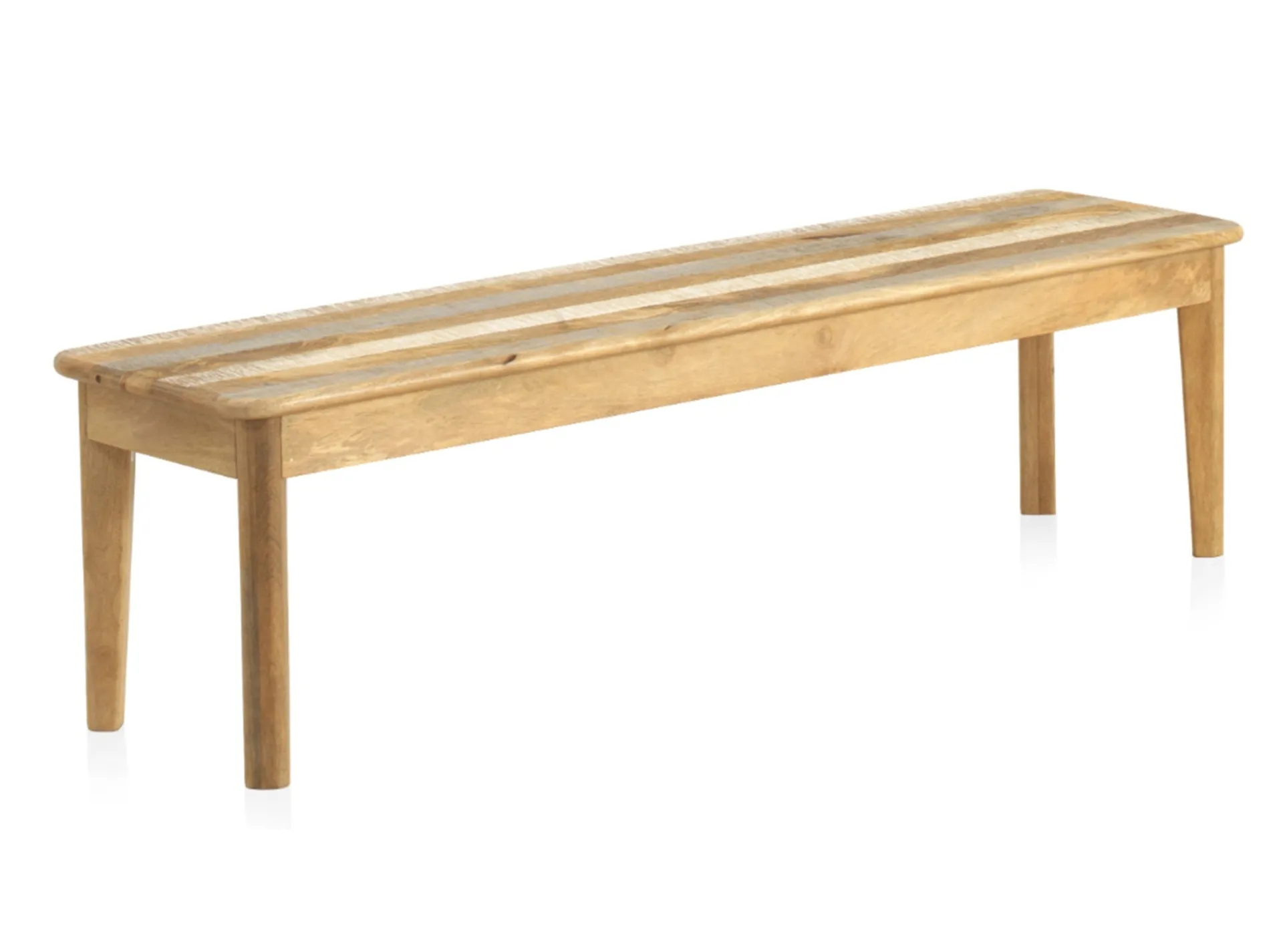Banco fabricado con madera maciza de mango en tonos natural y gris, que destaca por su diseño funcional y elegante. Ofrece espacio suficiente para acomodar de 3 a 4 personas, ideal para complementar el comedor o como asiento adicional en otros espacios. Las esquinas ligeramente redondeadas añaden un toque de suavidad al estilo del banco y mejoran su seguridad, convirtiéndolo en una opción perfecta para cualquier ambiente del hogar.