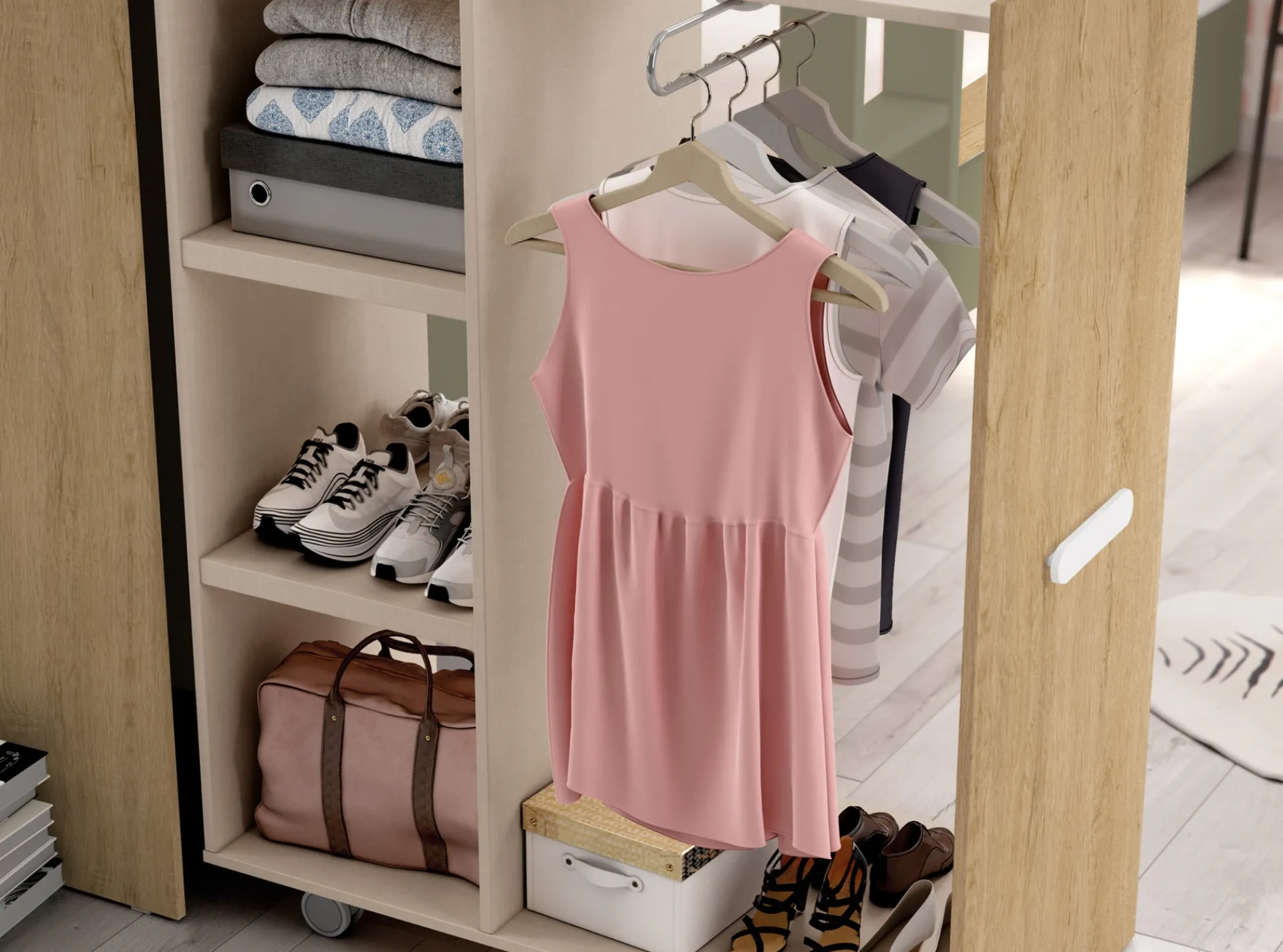 Módulo vestidor se desplaza sobre ruedas. Incluye 2 estantes fijos y una barra de colgar extraíble.