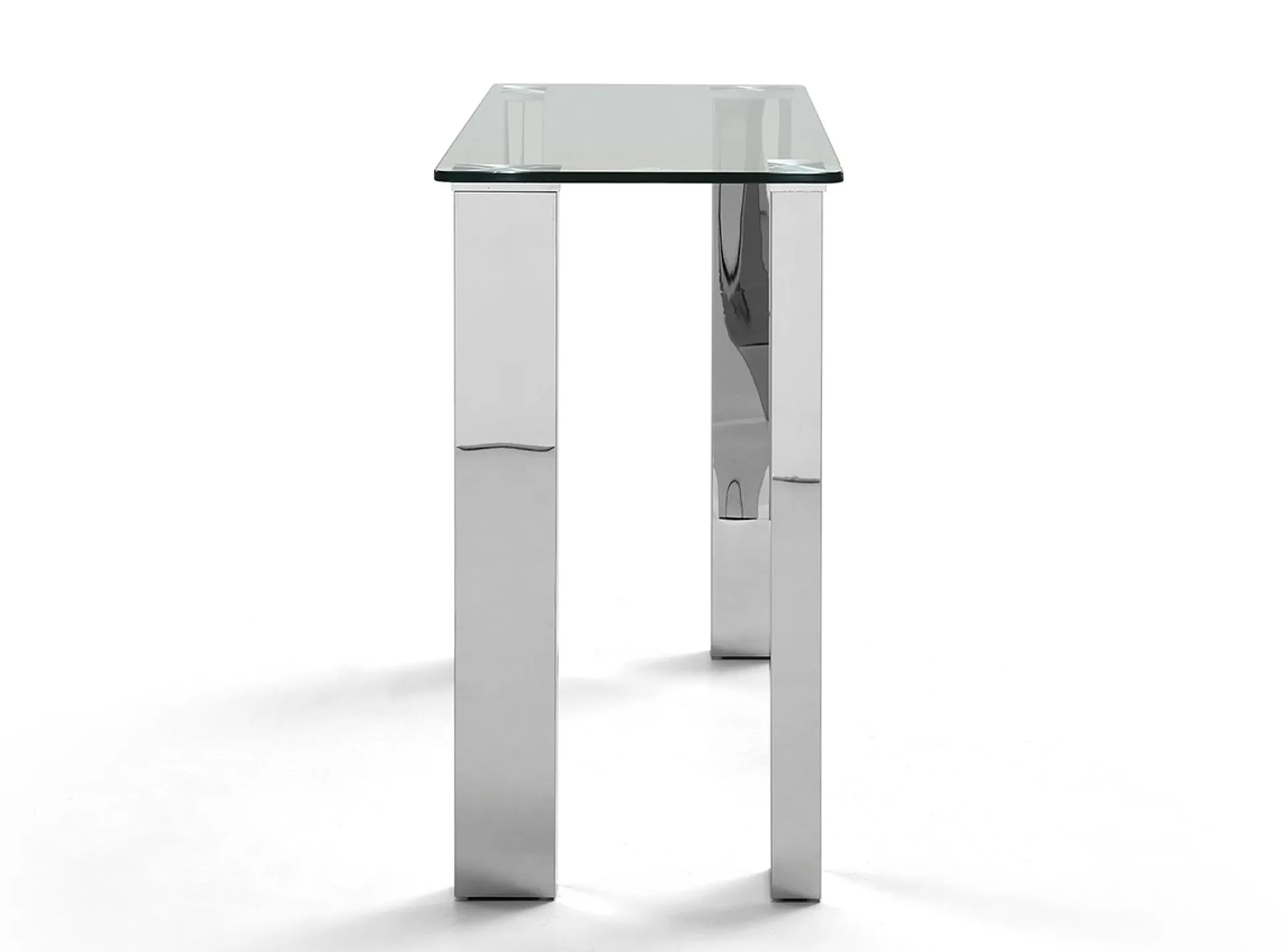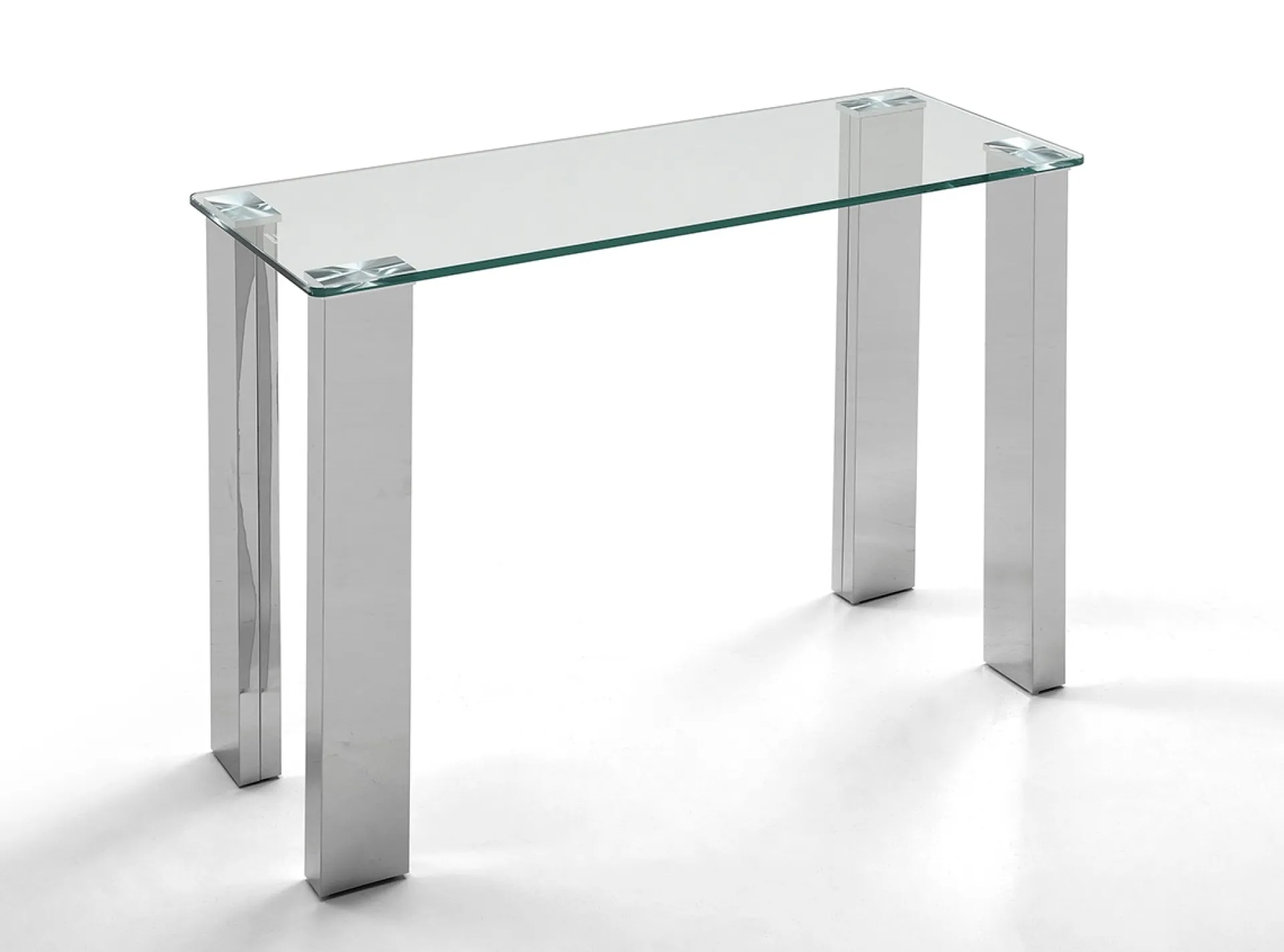 Esta consola de patas de acero inoxidable y sobre de cristal encaja en cualquier ambiente.