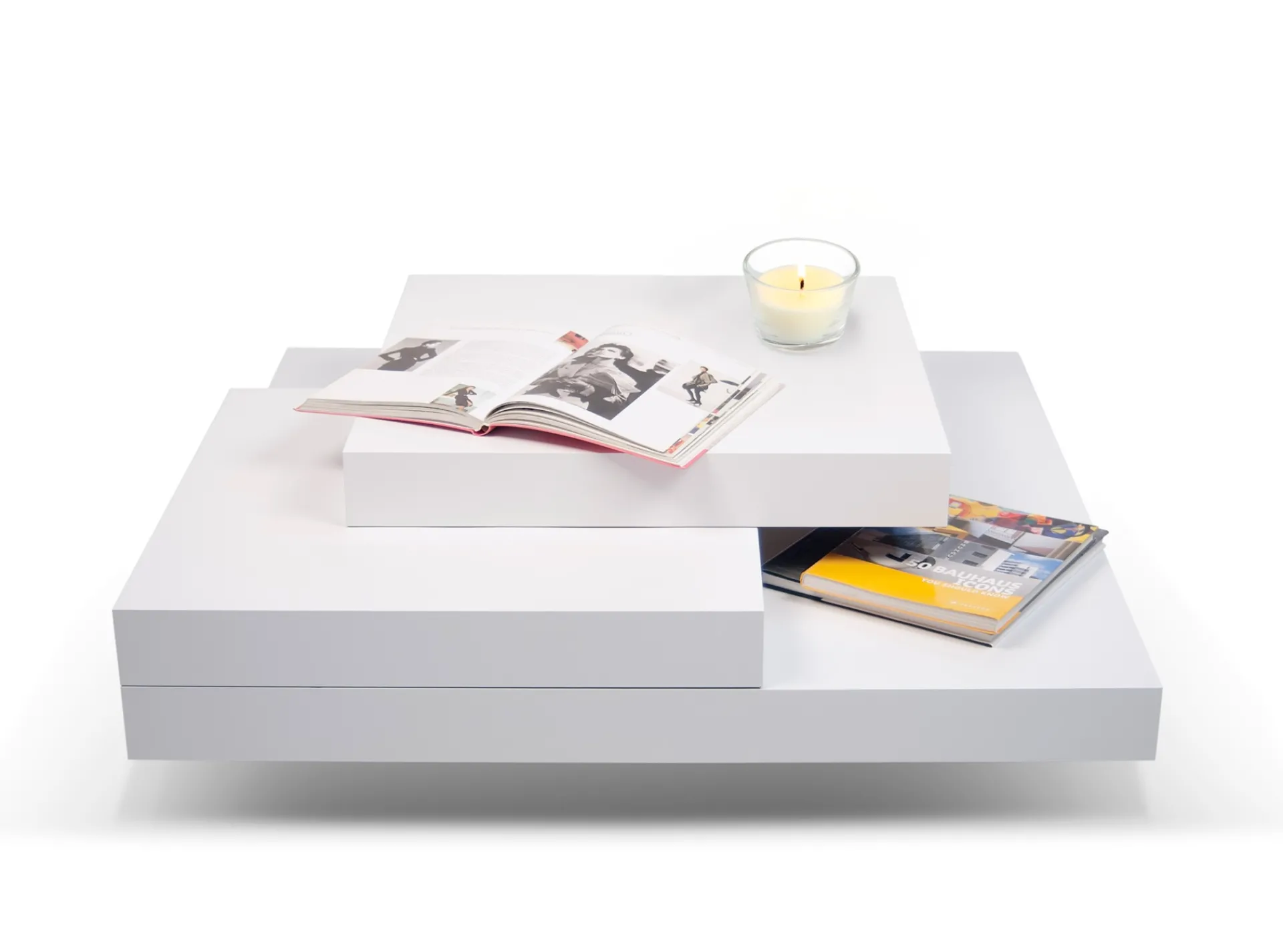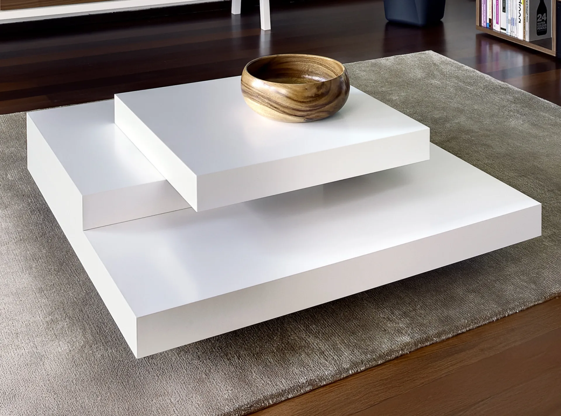 Esta mesa de centro destaca por su diseño minimalista y geométrico, presentando una estructura de tres niveles con planos que se superponen y se desplazan.