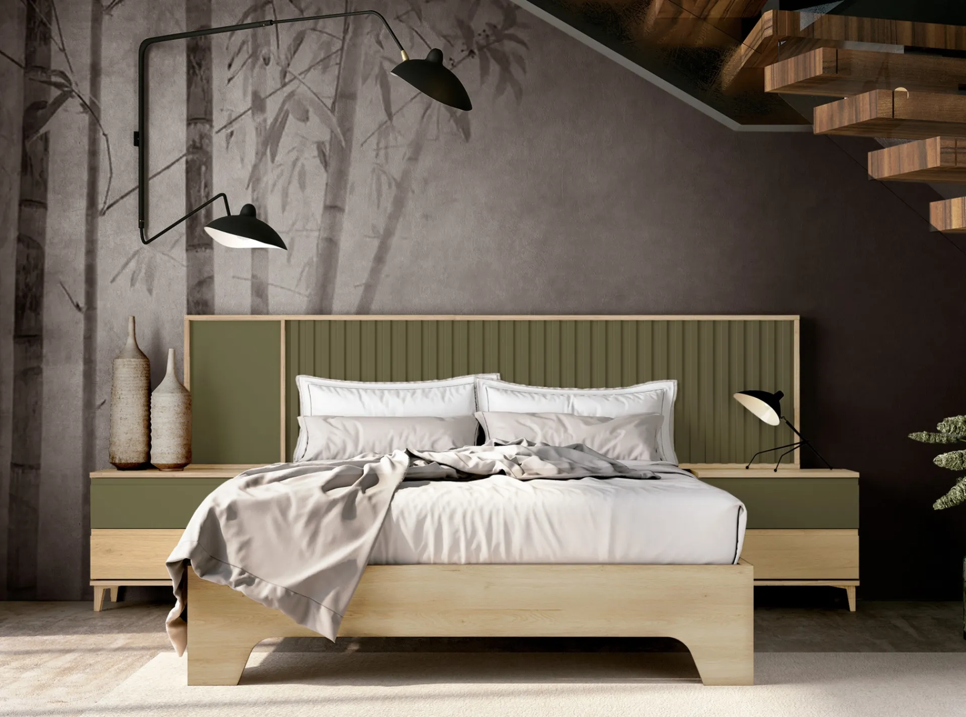 Conjunto de dormitorio que combina un diseño contemporáneo con la calidez de los tonos naturales. El aro de cama se complementa con un cabecero integrado que presenta paneles lisos y un distintivo diseño de lamas verticales. Las dos mesitas de noche a juego, con sus amplios cajones, ofrecen una solución de almacenamiento funcional y discreta, creando un ambiente de calma y sofisticación ideal para el descanso.